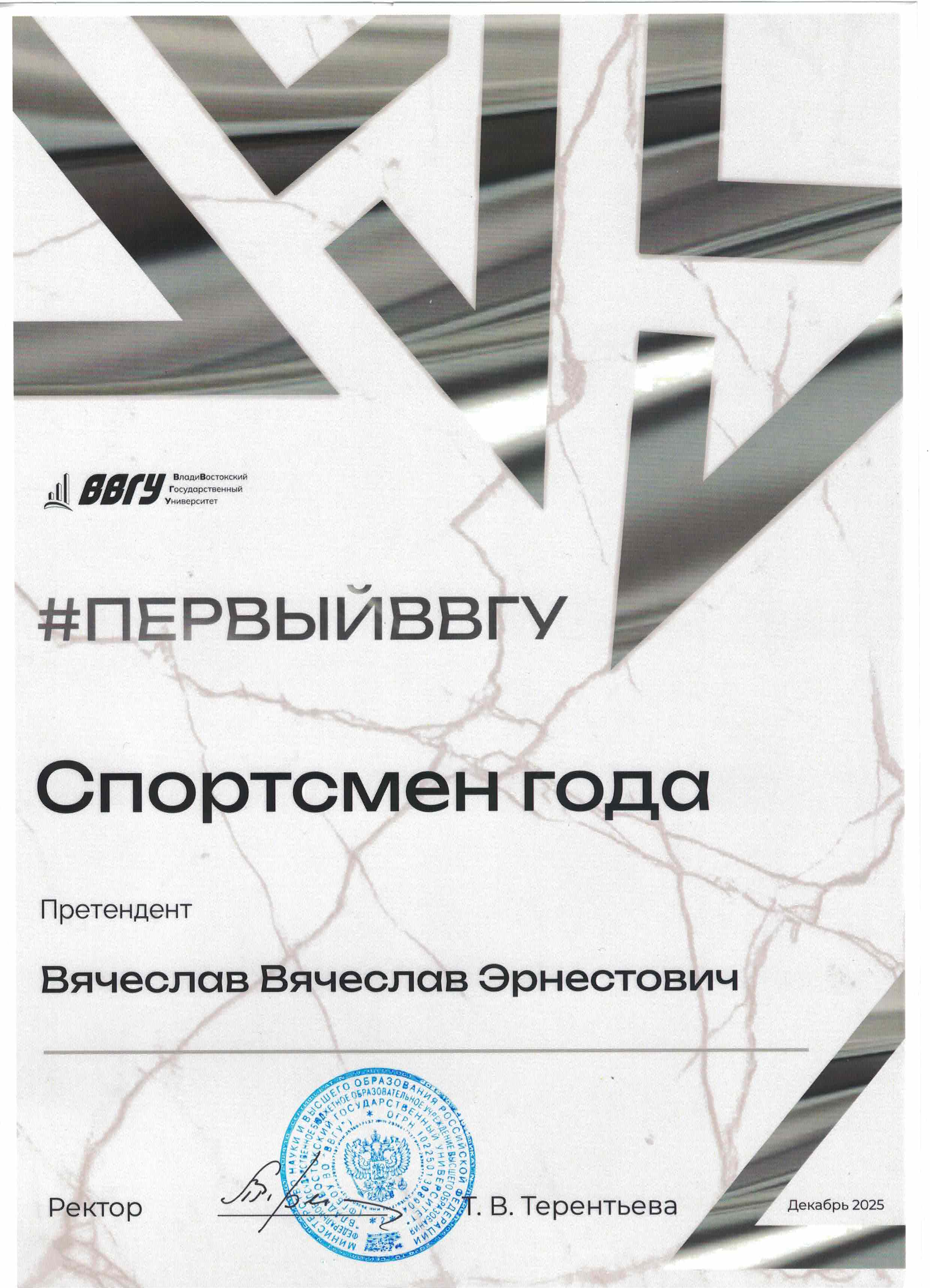 # первый ввгу спортсмен года Внутривузовский 20.12.2025 Победитель Грамота