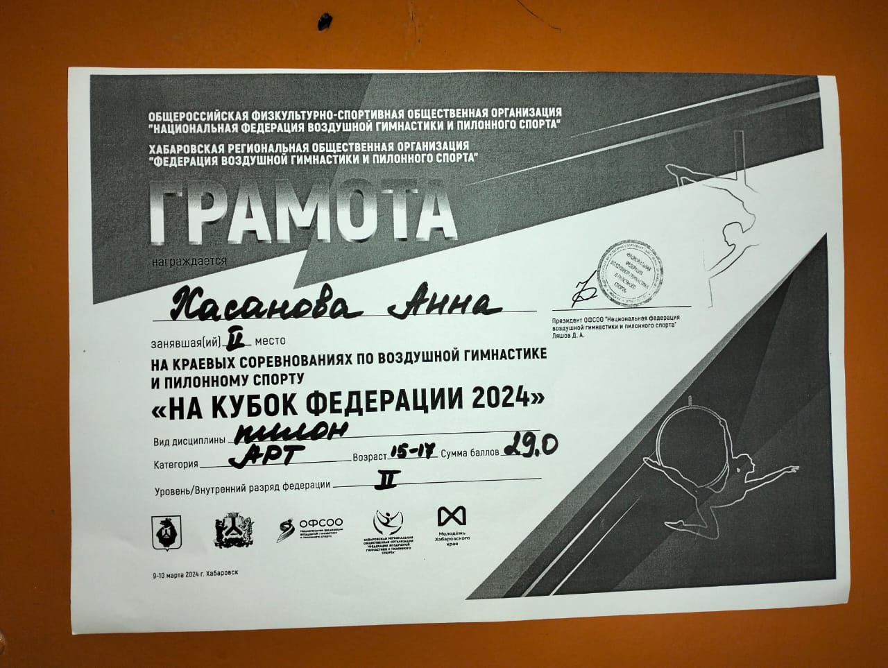Краевые соревнования по воздушной гимнастике и Пилонному спорту. "Кубок Федерации2024" | Городской, краевой | 09.03.2024 - 10.03.2024 | 2 место |