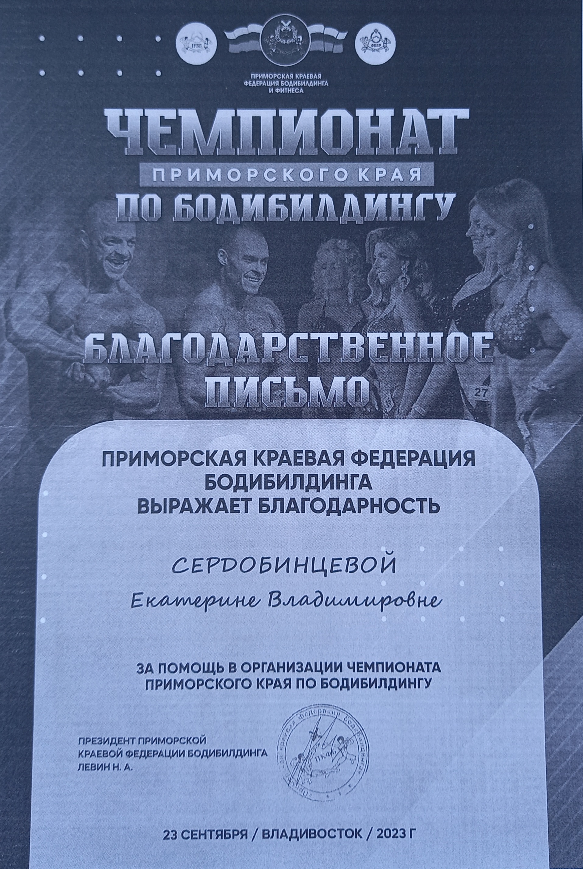 Чемпионат Приморского края по бодибилдингу | Городской, краевой | 23.09.2023 | Диплом |
