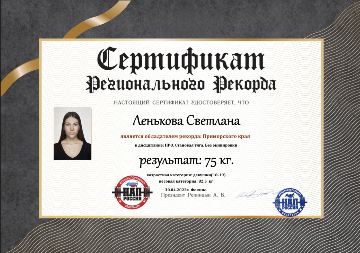 Рекорд Приморского края | Становая тяга | Городской, краевой | 30.04.2023 | Рекордсмен |