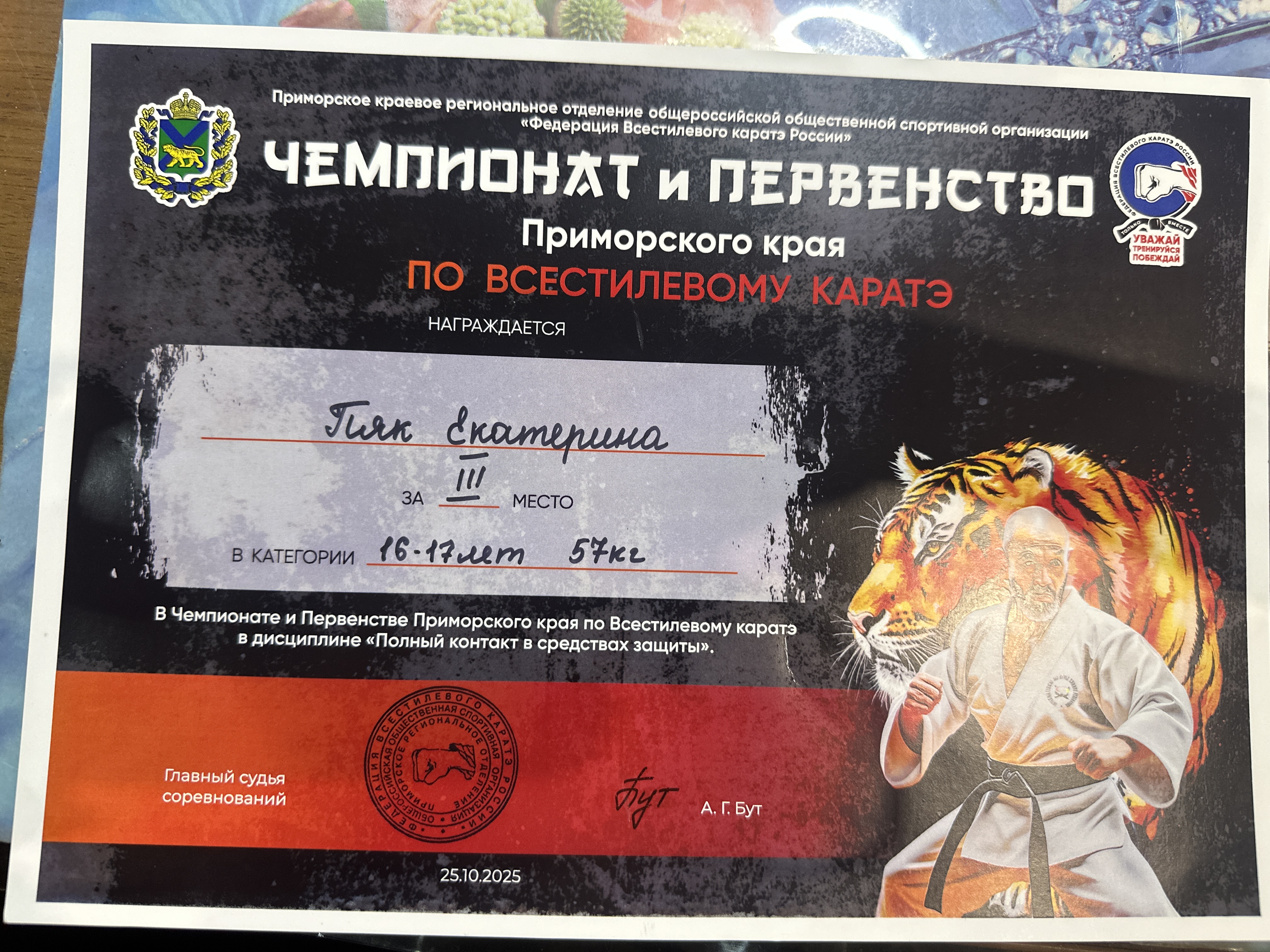 | Первенство Приморского края по встестилевому каратэ | Региональный | 25.10.2025 | 3 место |
