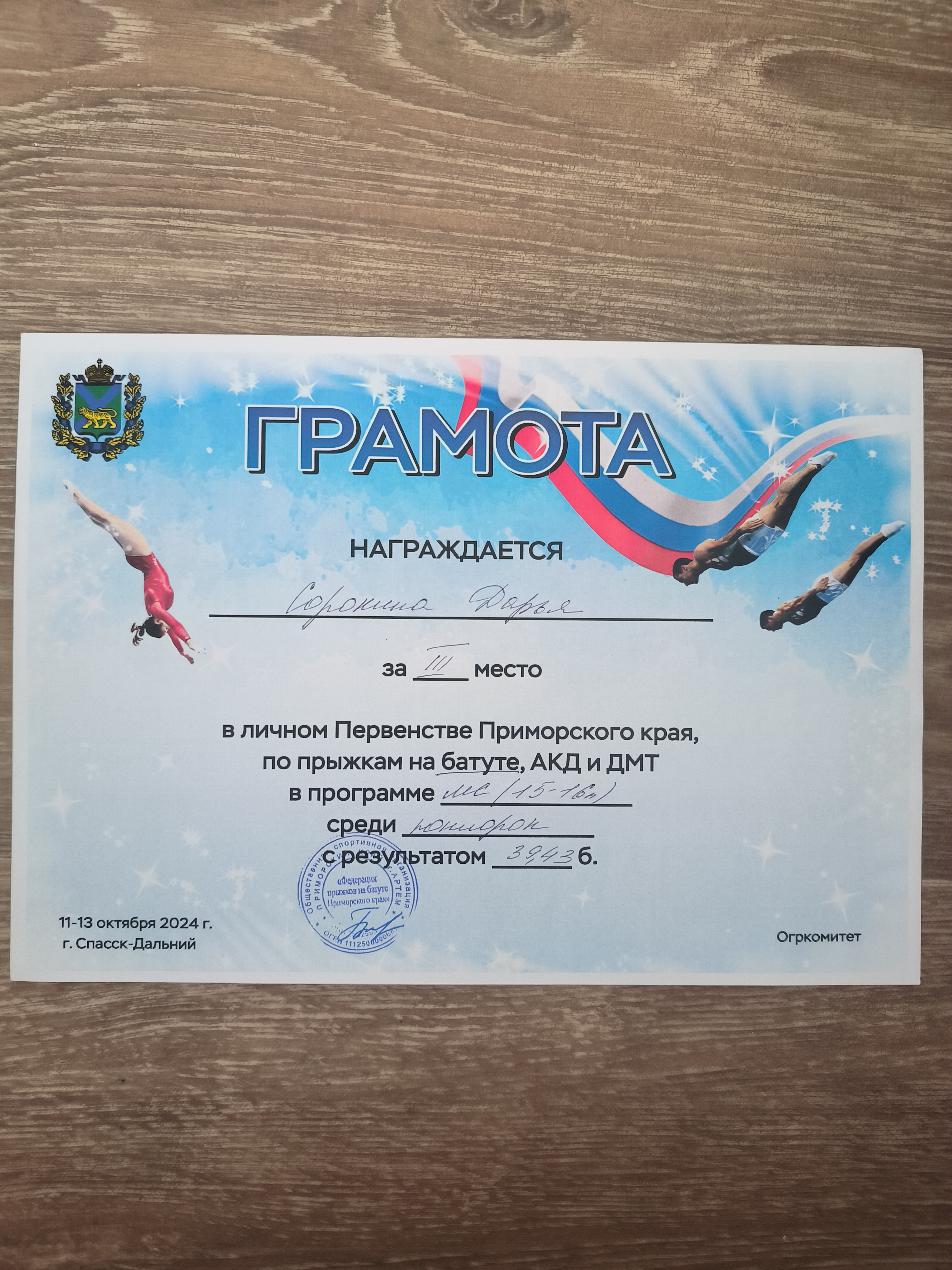 Личное первенство Приморского края, по прыжкам на батуте | Городской, краевой | 11.10.2024 - 13.10.2024 | 3 место |