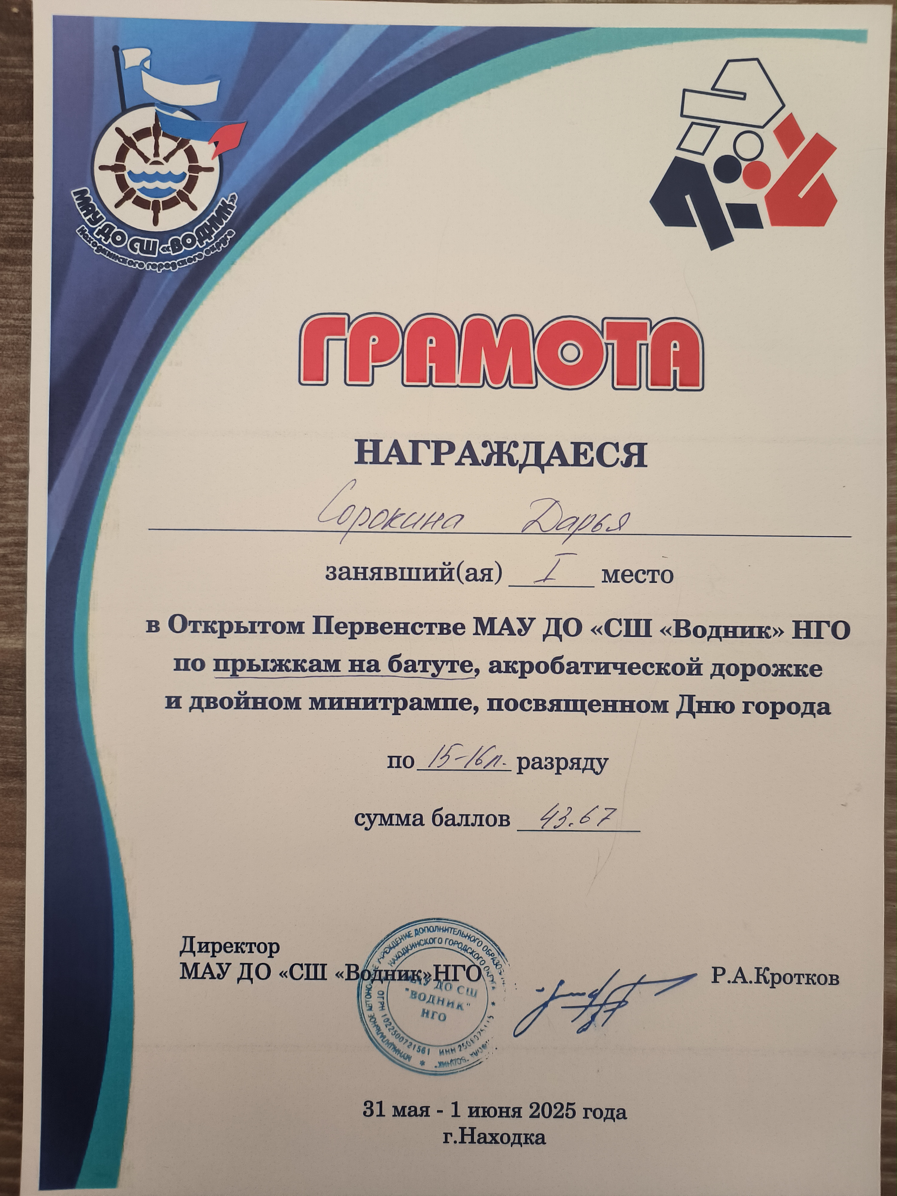 Открытое Первенство МАУ ДО «СШ«Водник» НГО по прыжкам на батуте | Городской, краевой | 31.05.2025 - 01.06.2025 | 1 место или гран-при |
