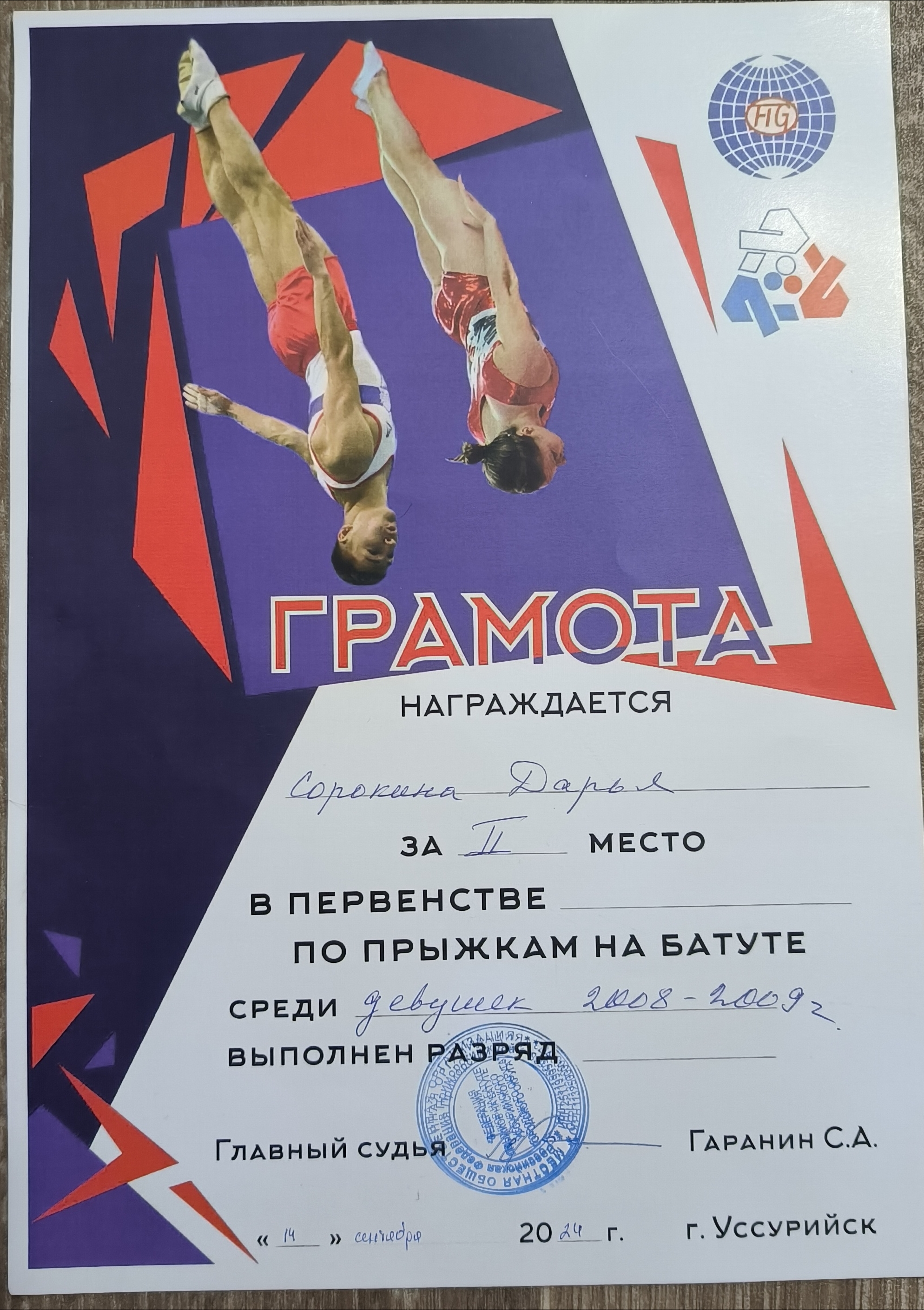 Первенство по прыжкам на батуте | Городской, краевой | 14.09.2024 | 2 место |