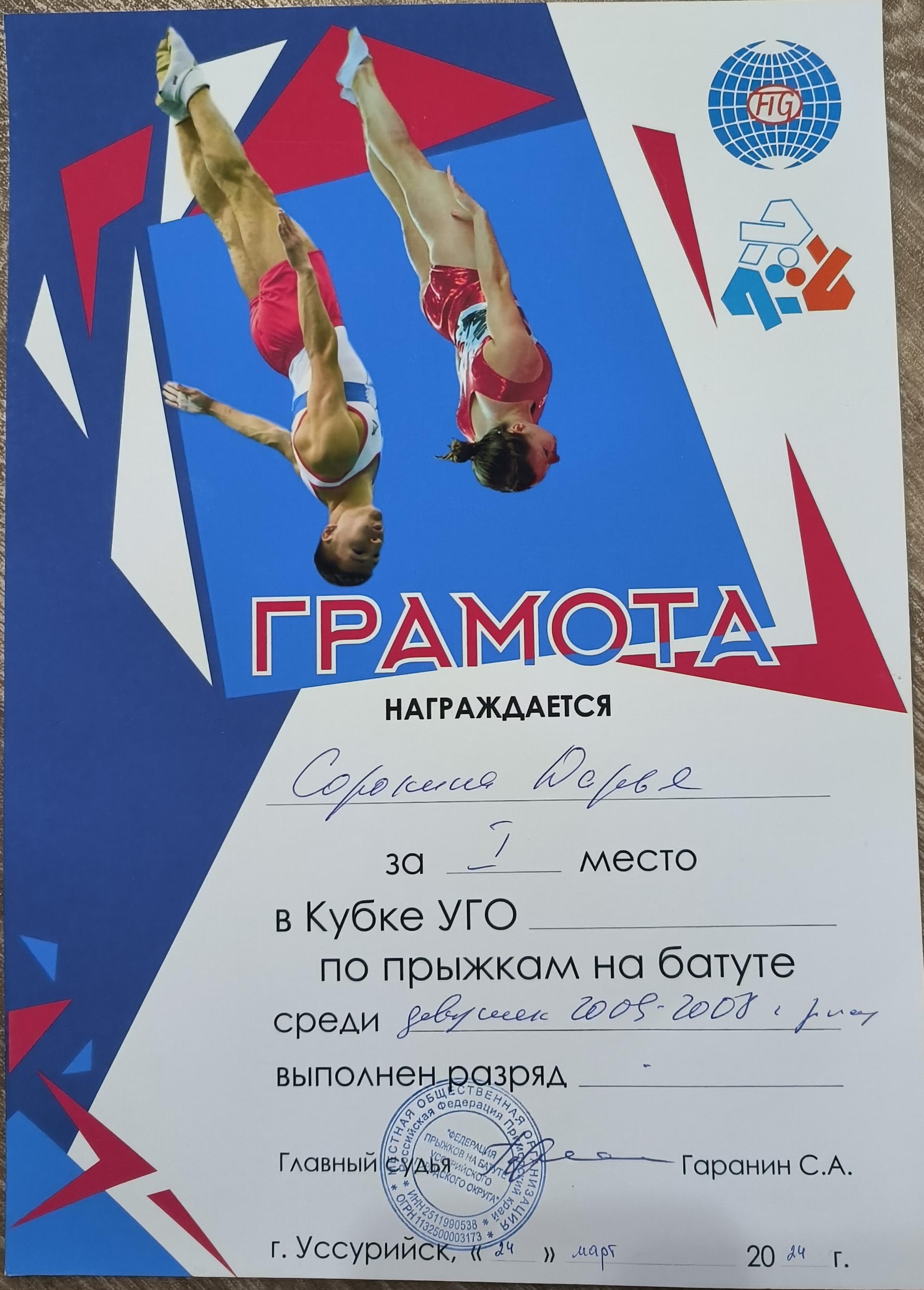 Кубок УГО по прыжкам на батуте | Городской, краевой | 24.03.2024 | 1 место или гран-при |