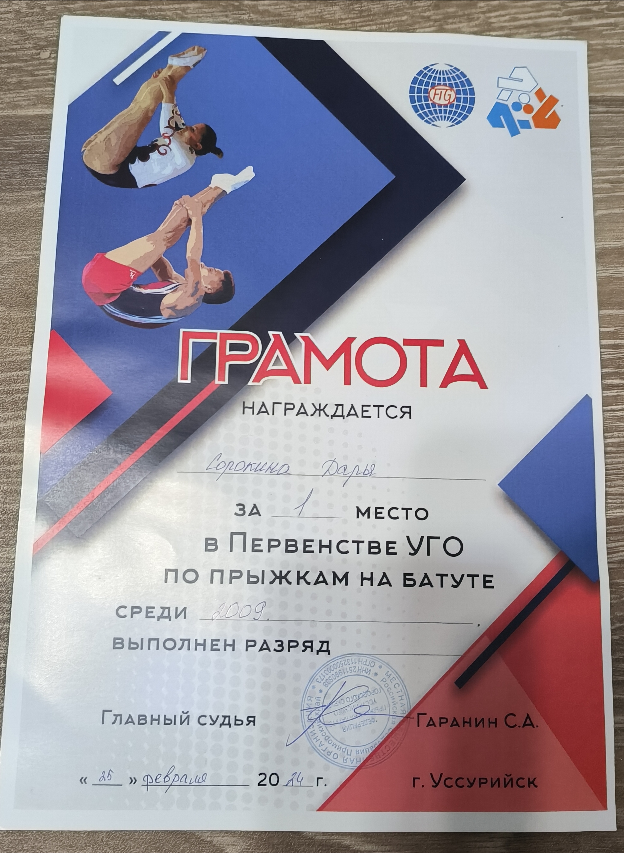 Первенство УГО по прыжкам на батуте | Городской, краевой | 25.02.2024 | 1 место или гран-при |