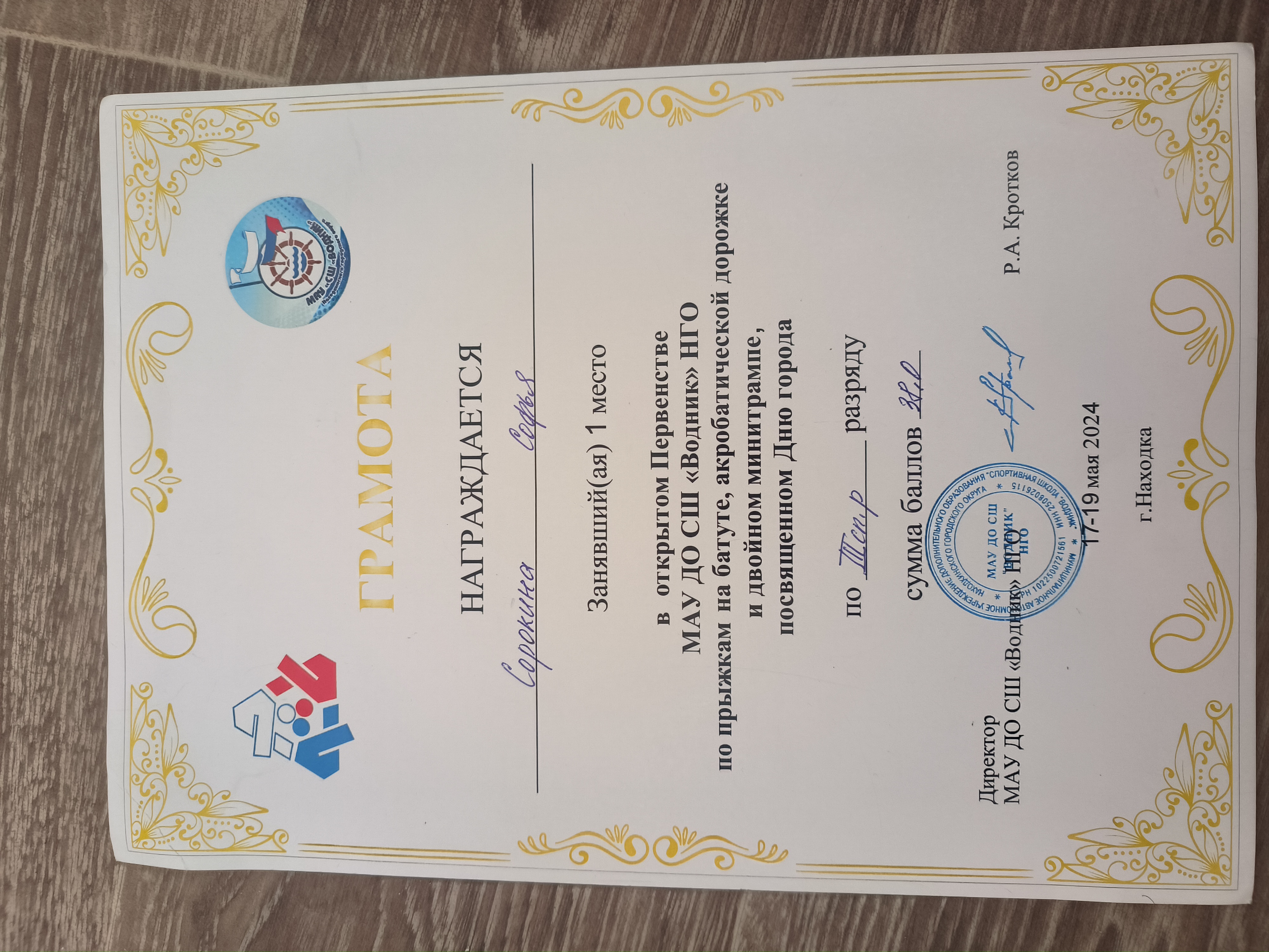 Открытое Первенство МАУ ДО «СШ«Водник» НГО по прыжкам на батуте | Городской, краевой | 17.05.2024 - 19.05.2024 | 1 место или гран-при |