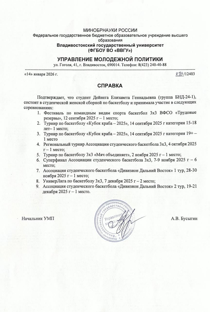 | Турнир по баскетболу 3х3 "Кубок краба"-2025 г.Владивосток категория 15-18 лет | Баскетбол 3х3 | Городской, краевой | 14.09.2025 | 2 место |