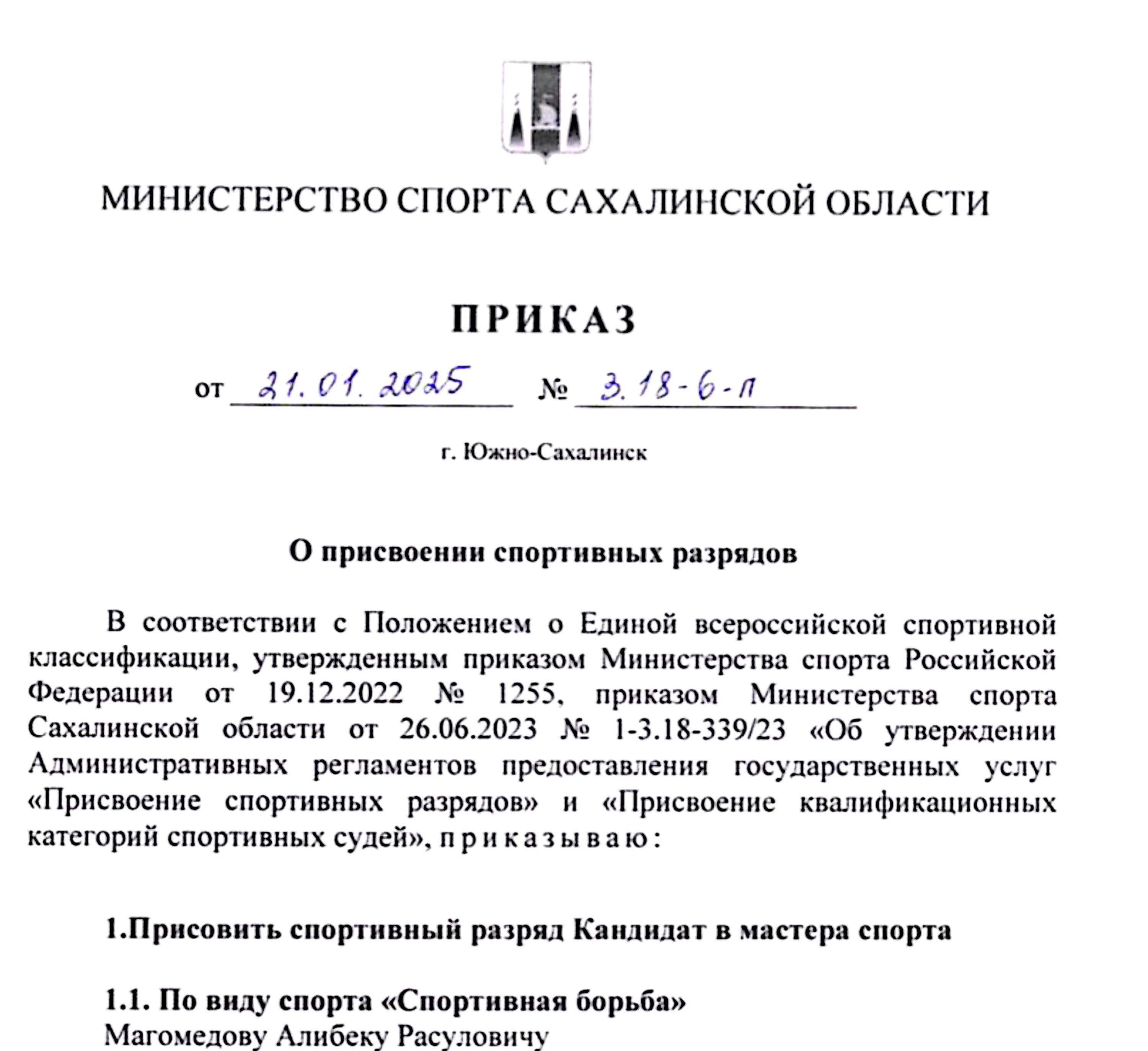 Присвоение спортивного разряда | Приказ | Городской, краевой | 21.01.2025 | Кандидат в мастера спорта |