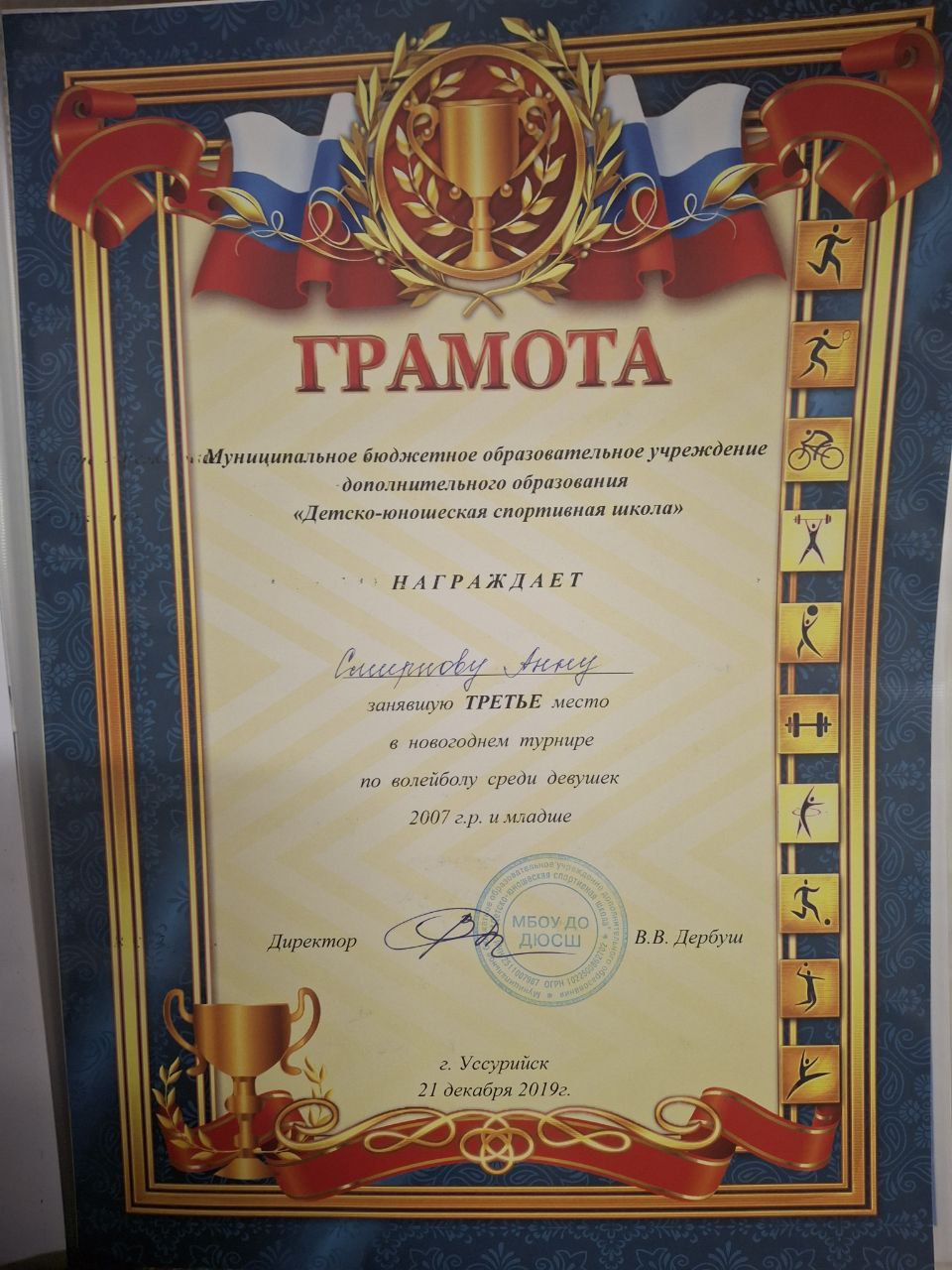 Новогодний турнир по волейболу среди девушек 2007 г. | Городской, краевой | 21.12.2019 | 3 место |