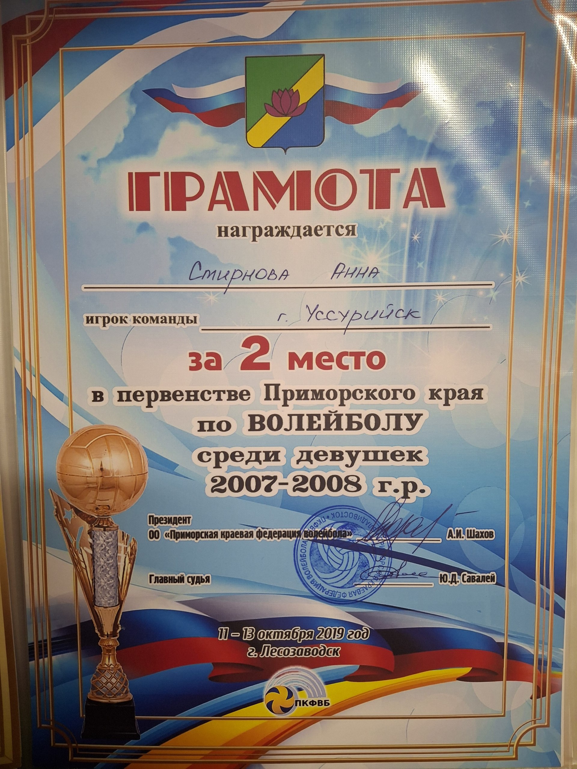 Первенство Приморского края по ВОЛЕЙБОЛУ среди девушек 2007-2008 г.р. | Региональный | 11.10.2019 - 13.10.2019 | 2 место |