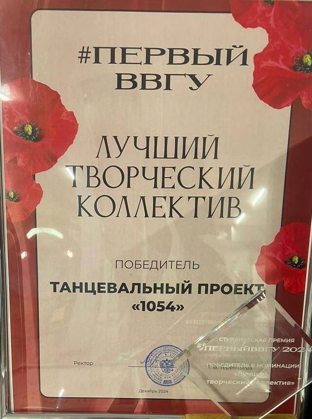 Студенческая премия #ПЕРВЫЙВВГУ | Студенческая премия | Внутривузовский | 20.12.2024 - 20.12.2024 | Победитель |