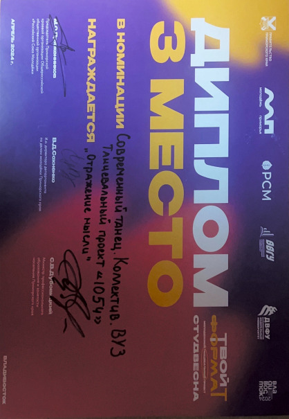 Молодежный танцевальный проект "Твой формат" в рамках регионального фестиваля "Российская студенческая весна" | Конкурс | Региональный | 30.04.2024 - 30.04.2024 | 3 место |