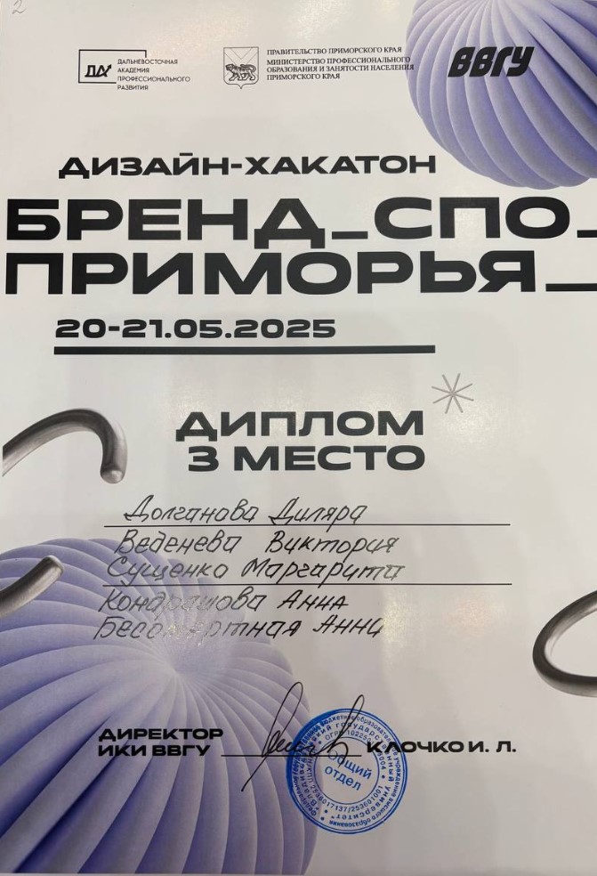 | Дизайн-хакатон "Бренд СПО Приморья" | Городской, краевой | 20.05.2025 - 21.05.2025 | Диплом |
