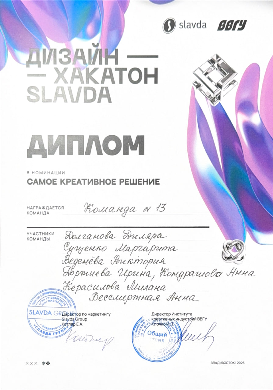 | Дизайн-хакатон "Slavda" | Городской, краевой | 10.04.2025 - 11.04.2025 | Диплом |