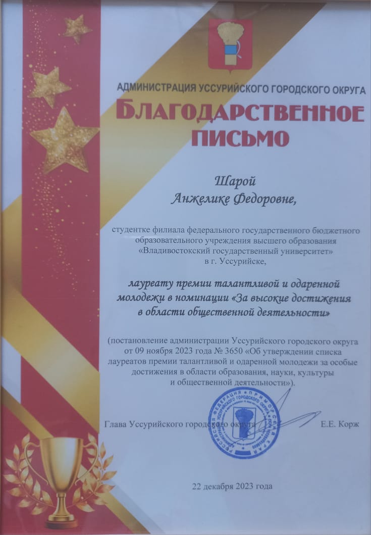 благодарственное письмо | Региональный | Региональный | 22.12.2023 | лауреат |