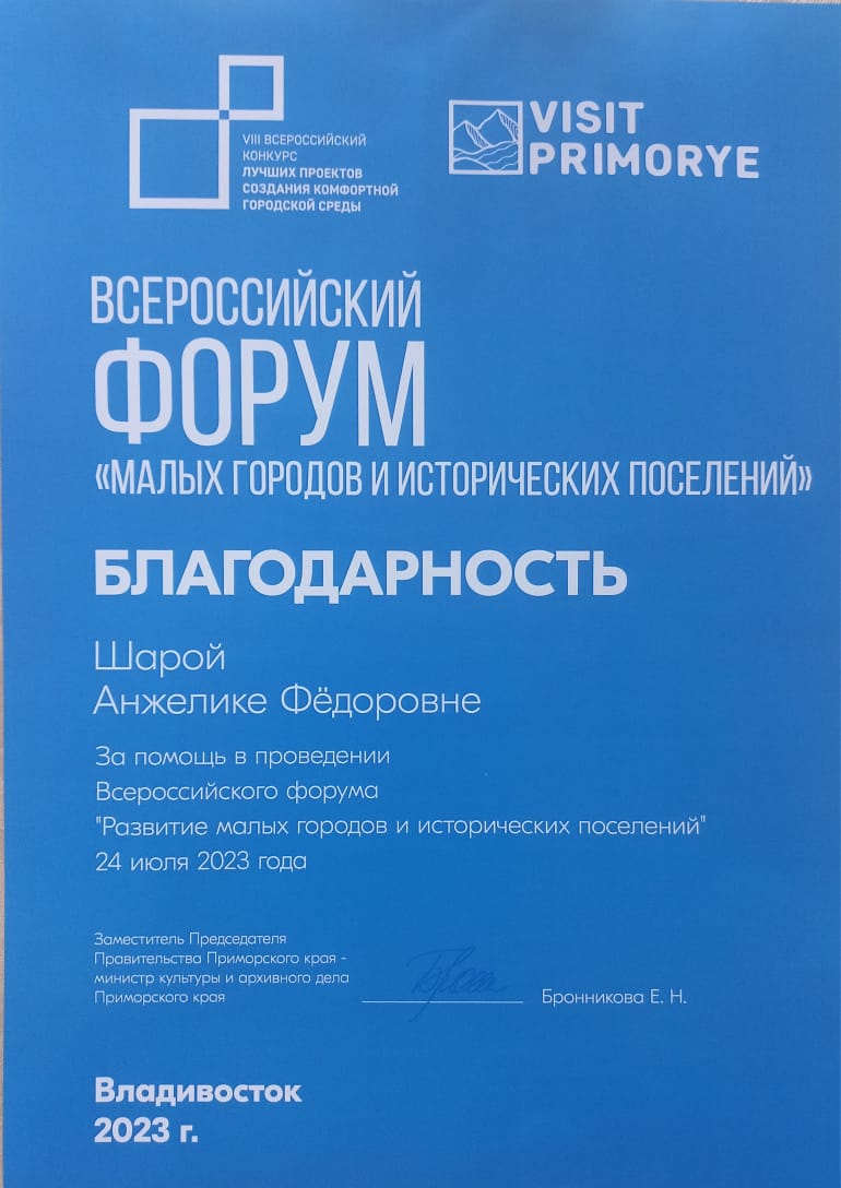 Всероссийский форум "малых городов и исторических поселений" | всероссийский | Всероссийский | 23.07.2023 - 25.07.2023 | Участник |