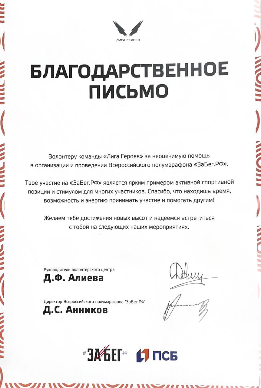 Всероссийский полумарафон "ЗаБег.РФ" | волонтерство | Всероссийский | 22.05.2022 | Участник |