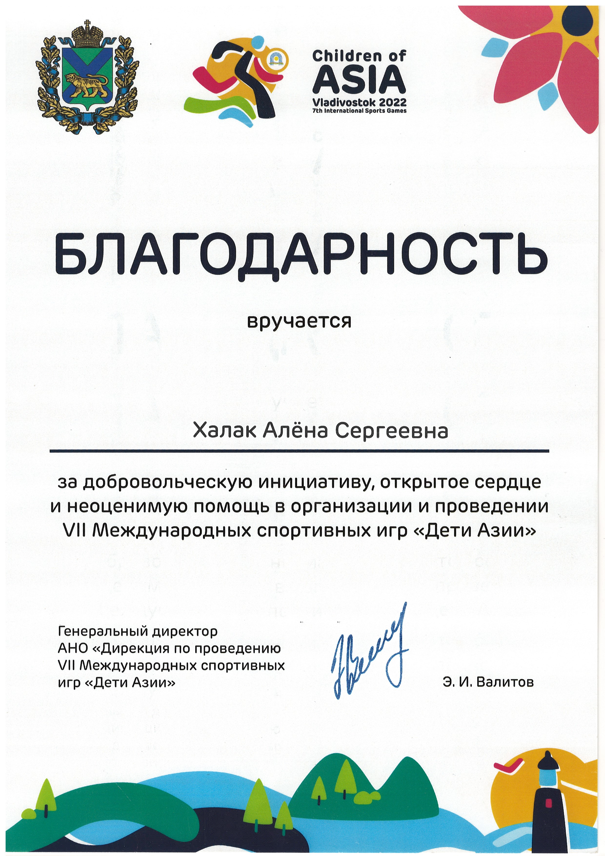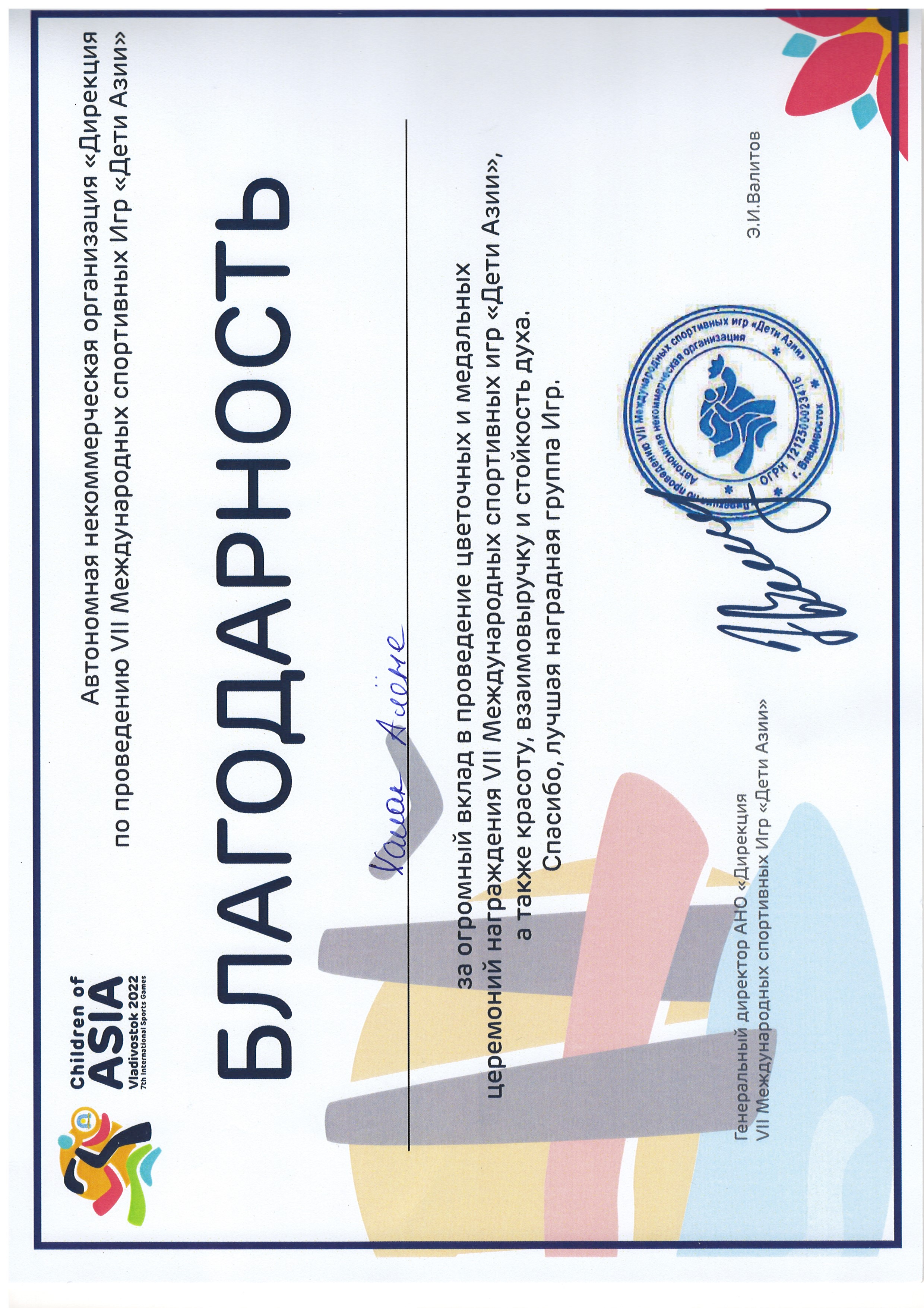 7 Международные спортивные игры "Дети Азии" | дети Азии | Международный | 28.07.2022 - 30.09.2022 | Волонтер наградной группы |