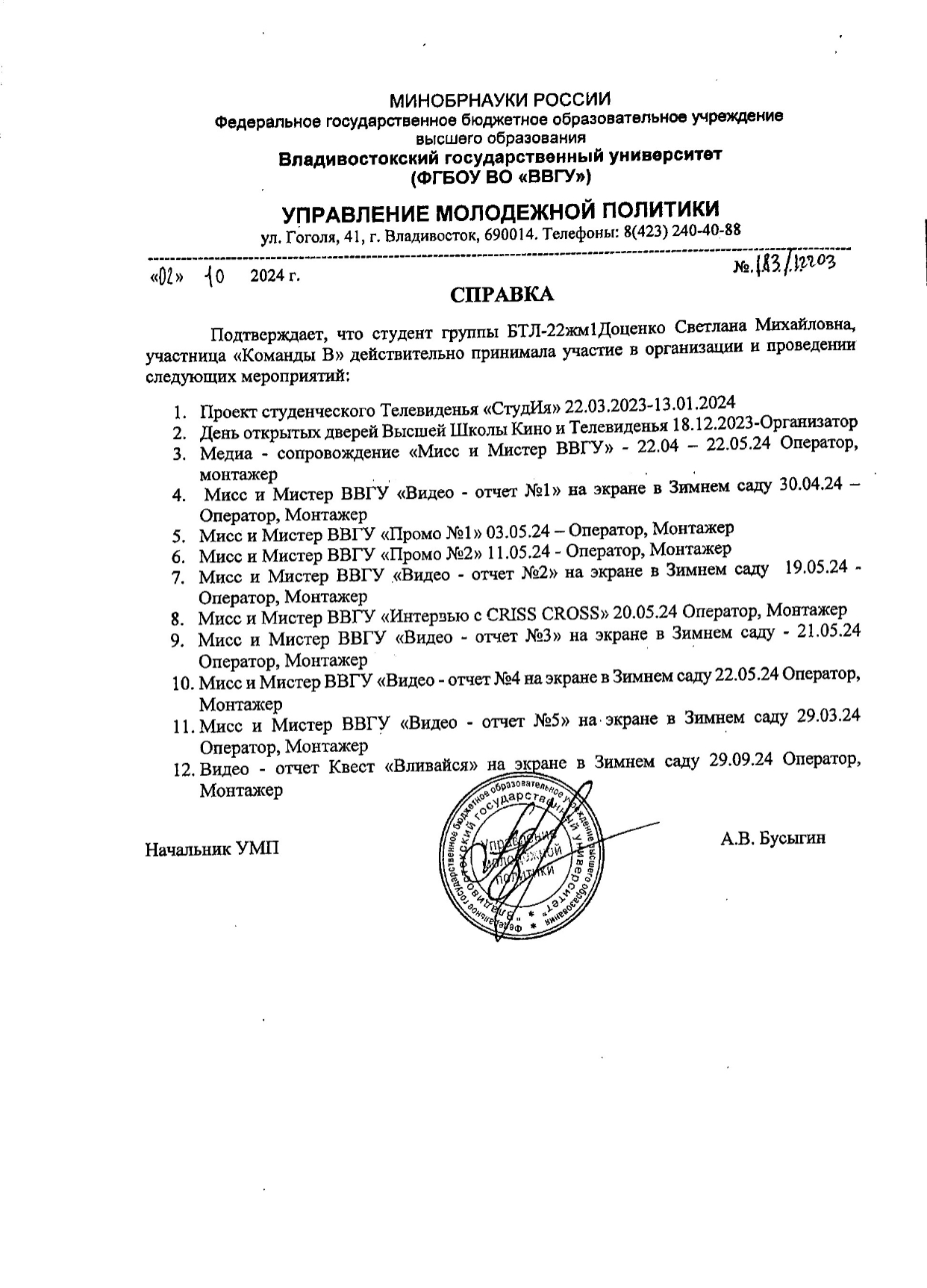 | Звездная осень ВВГУ-2022 | Внутривузовский | 24.11.2022 - 24.11.2022 | 3 место | Диплом | |||