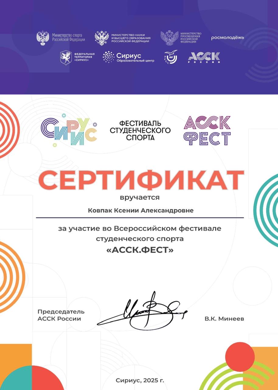 Всероссийский фестиваль студенческого спорта АССК.ФЕСТ | Всероссийский | 23.05.2025 - 28.05.2025 | Участник |