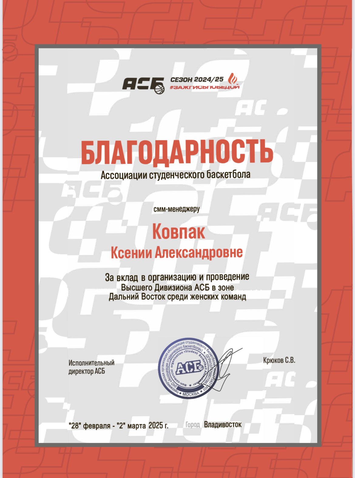 Благодарность за вклад и развитие ССК ВВГУ | Внутривузовский | 19.02.2025 - 19.02.2025 |