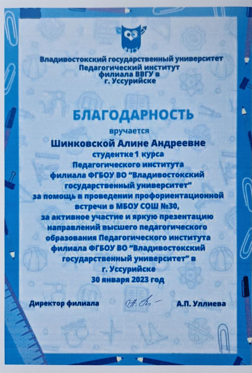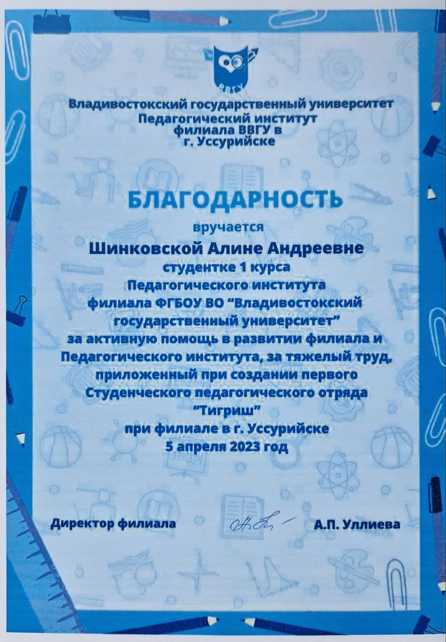 Помощь филиалу, создание первого студенческого отряда ("Тигриш") при филиале ВВГУ в г.Уссурийске | Внутривузовский | 05.04.2023 - 05.04.2023 | Участник |