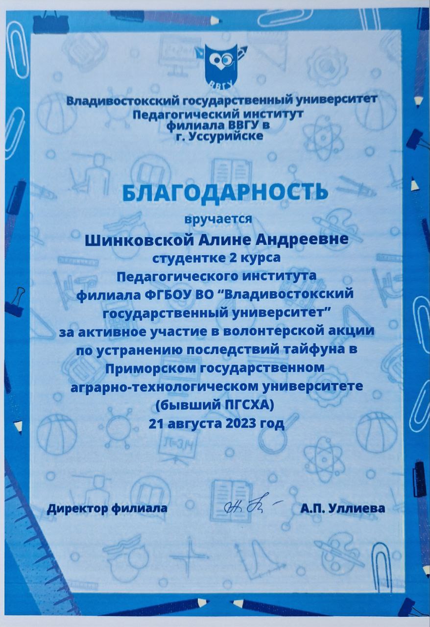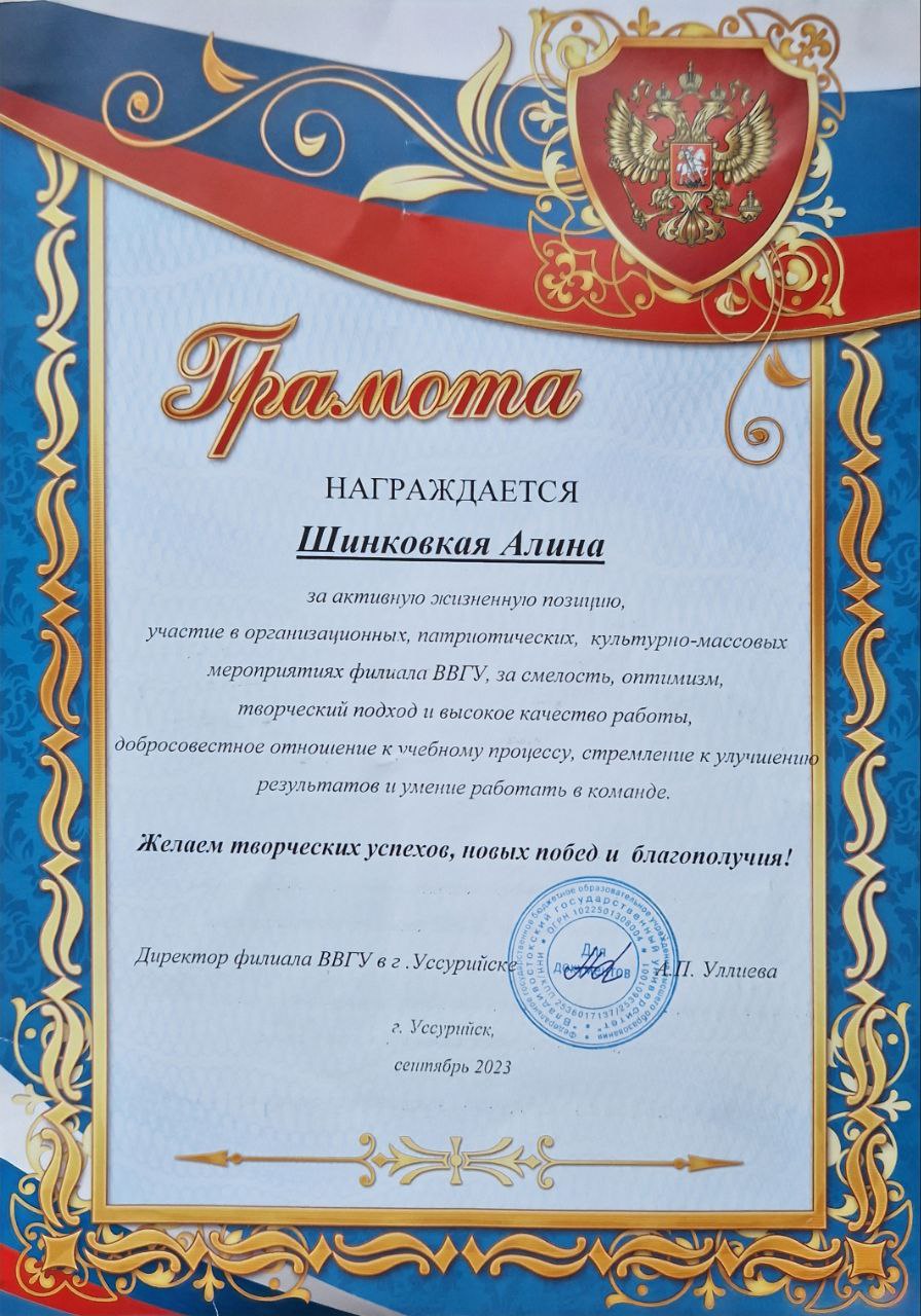 Помощь филиалу, участие в организационных, патриотических, культурно-массовых мероприятиях филиала ВВГУ | Внутривузовский | 01.09.2022 - 01.09.2023 | Участник |