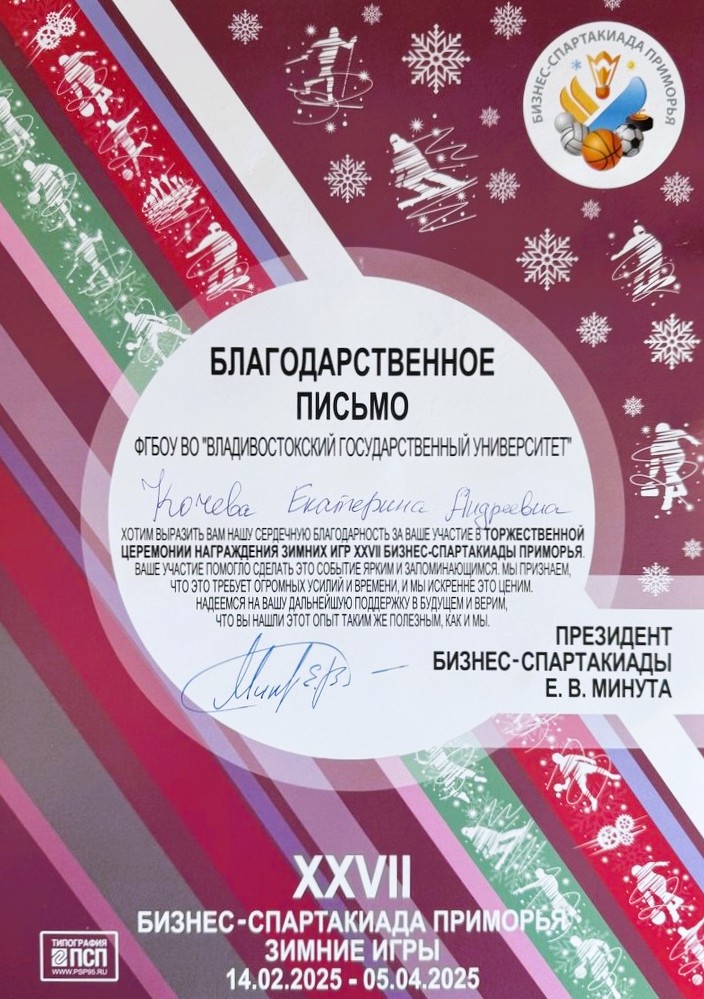 XXVII Бизнес-спартакиада Приморского края | Региональный | 14.02.2025 - 05.04.2025 | Участник |