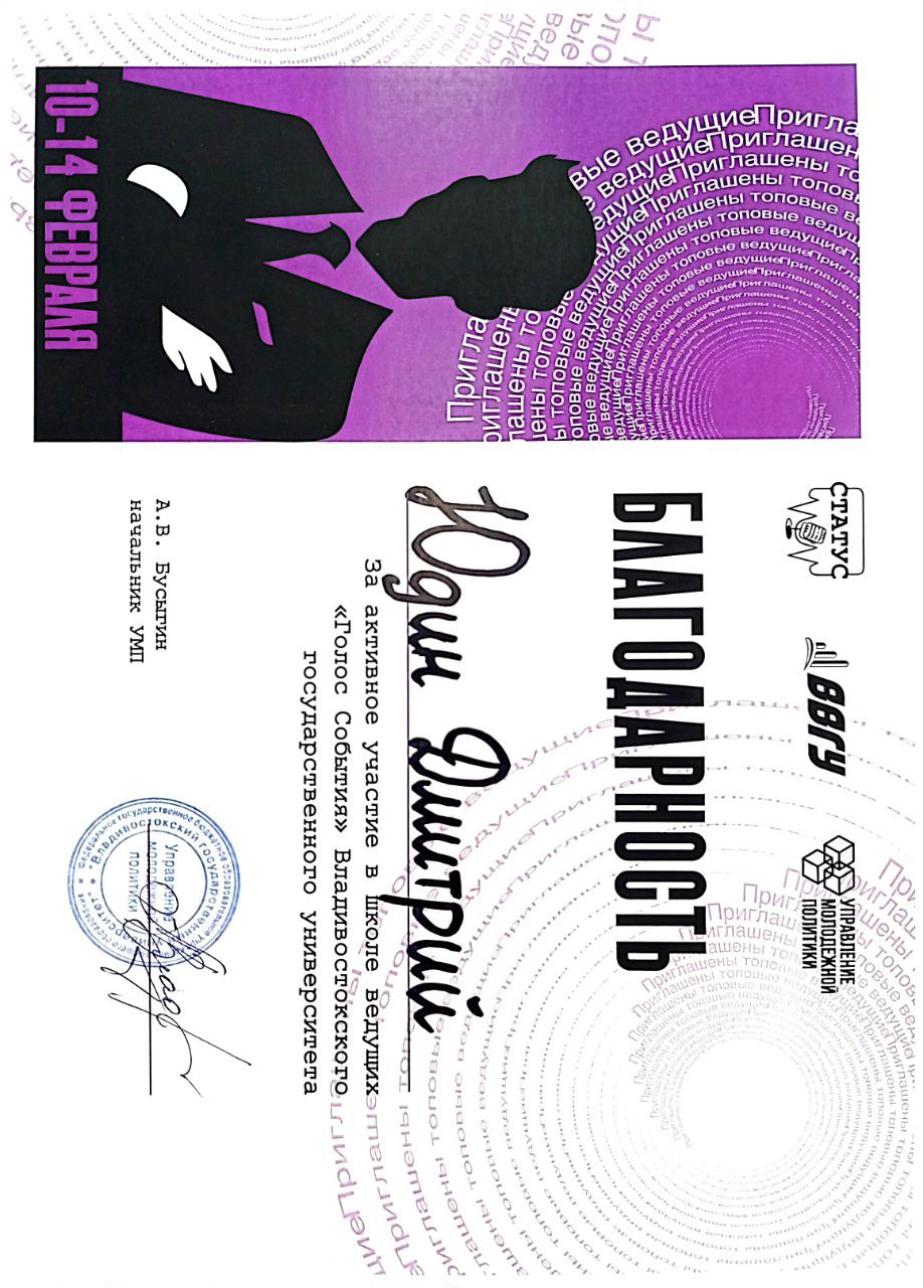 Школа ведущих «Голос Событий» Внутривузовский 14.02.2025 - 14.02.2025 Участник Благодарность