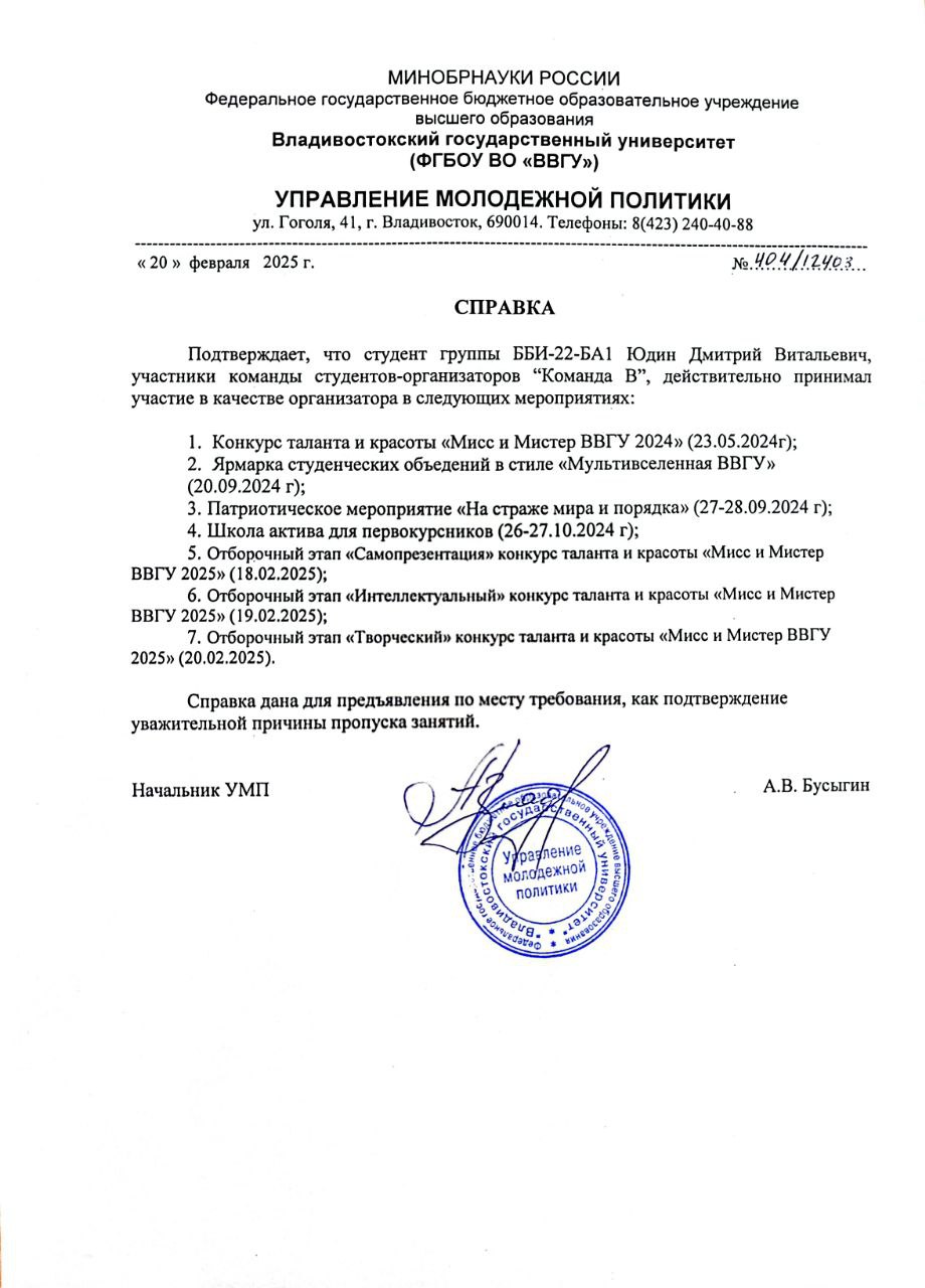 Отборочный этап «Интеллектуальный» конкурс таланта и красоты «Мисс и Мистер ВВГУ 2025» Внутривузовский 18.02.2025 - 18.02.2025 Организатор Справка