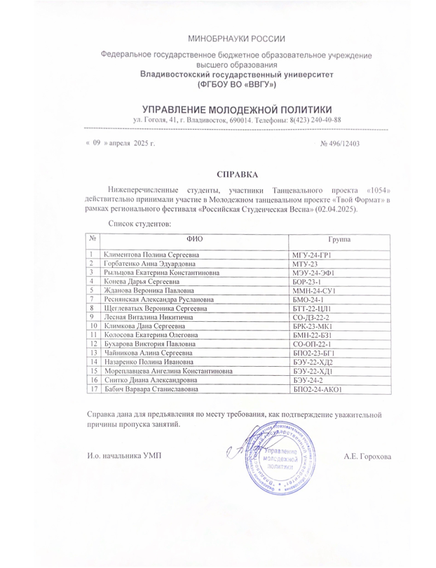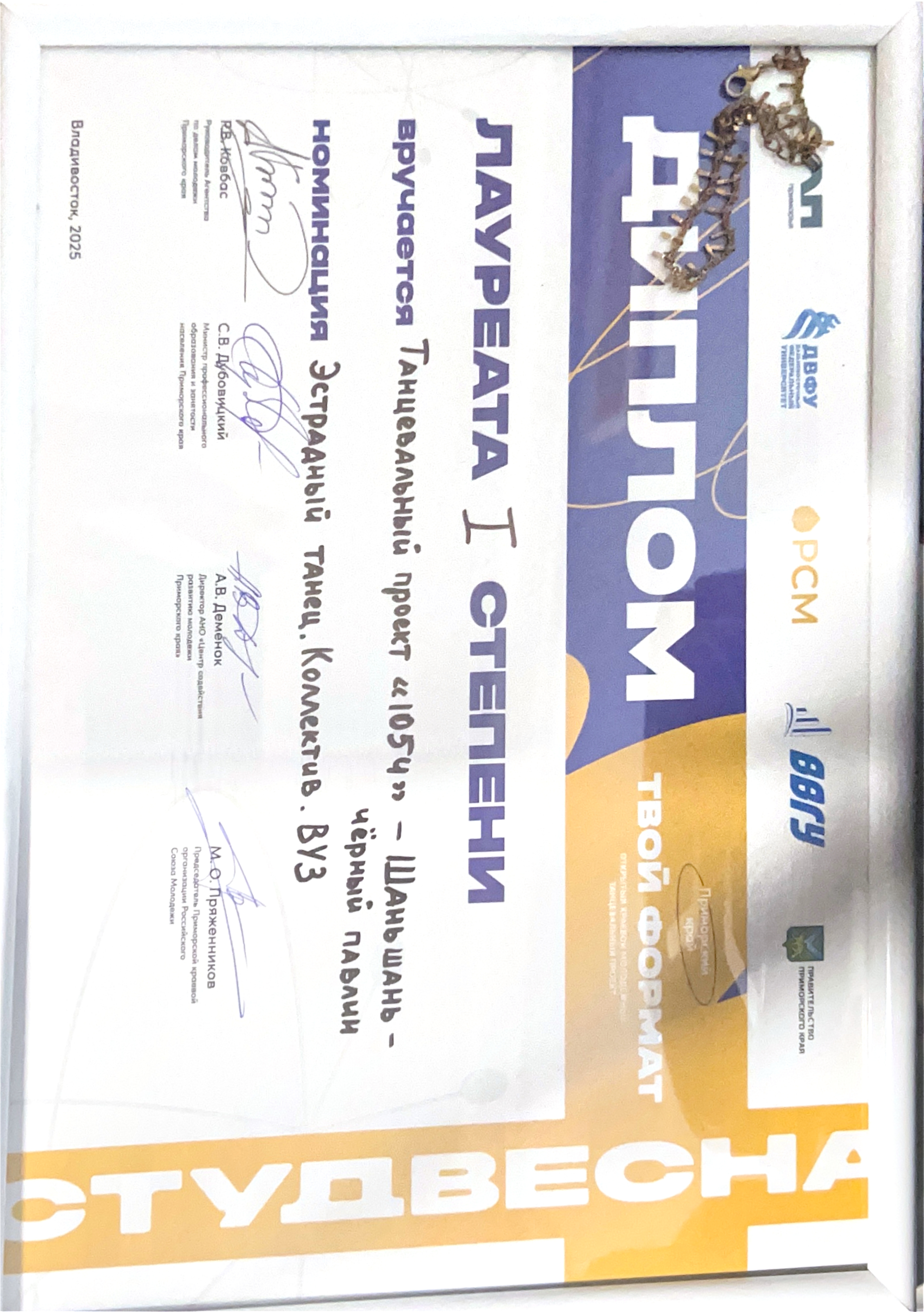 Молодежный танцевальный проект "Твой формат" в рамках регионального фестиваля "Российская студенческая весна" | Конкурс | Региональный | 02.04.2025 | 1 место или гран-при |
