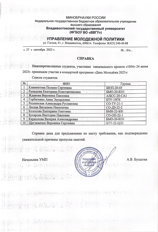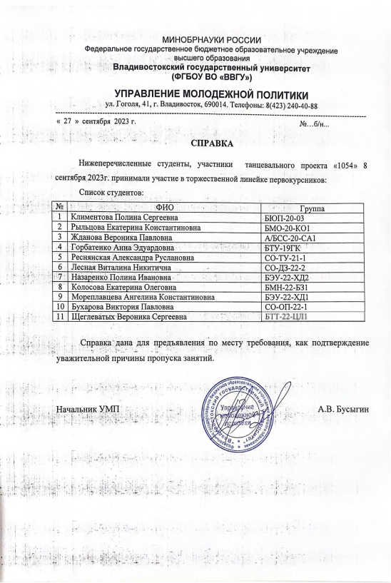 Концертная программа "Посвящение первокурсников ВВГУ 2023" | Концерт | Внутривузовский | 10.10.2023 | Участник |