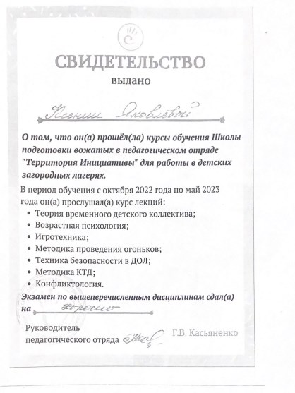 Инструктивные сборы по подготовки в летнему трудовому семестру | Внутривузовский | 06.06.2023 - 08.06.2023 | Призер | Справка | Касьяненко Галина Владимировна | ||