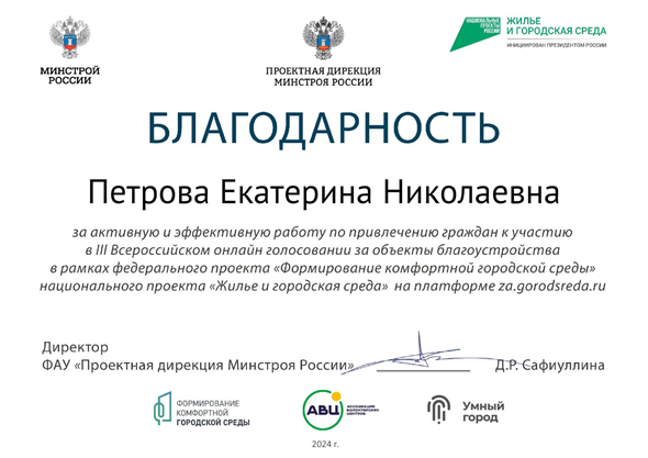 Волонтерское участие в проведении Голосования по проекту "Городская среда" | Всероссийский | 14.01.2024 - 30.04.2024 | Участник |