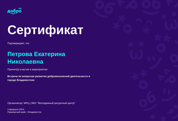 Участие во Встрече по вопросам развития добровольческой деятельности | Городской, краевой | 03.02.2024 - 03.02.2024 | Участник |