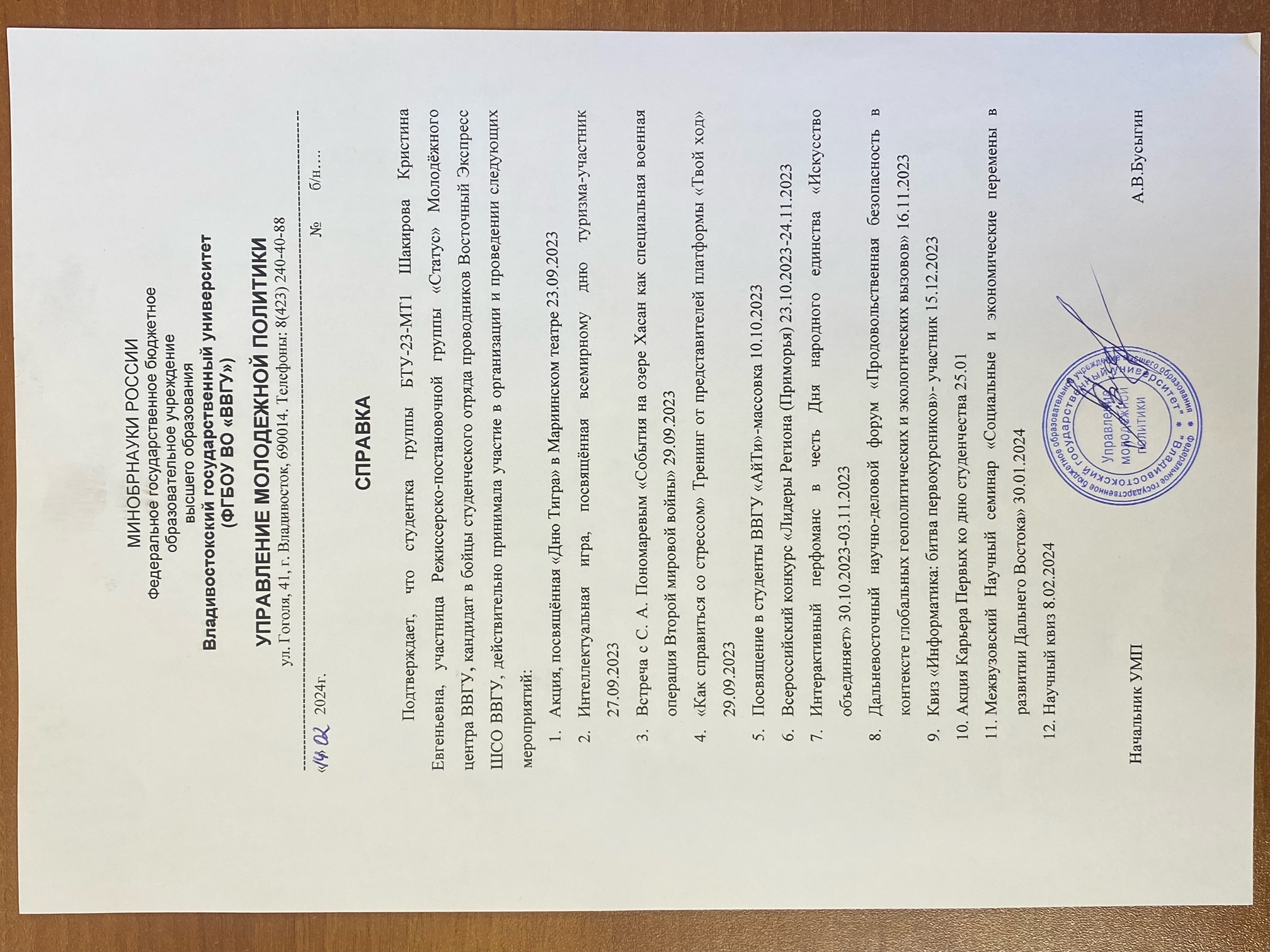 | Посвящение в студенты ВВГУ «АйТи» | Концертная программа | Внутривузовский | 10.10.2023 - 10.10.2023 | Участник |
