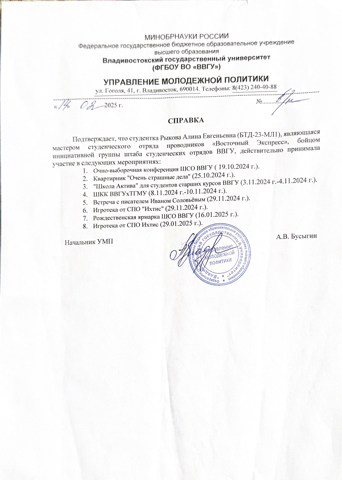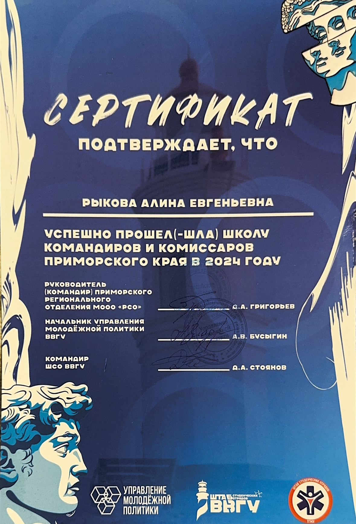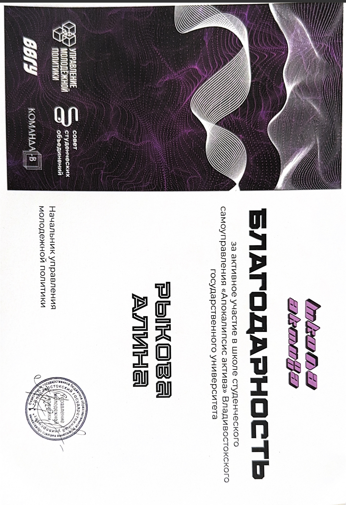 Школа актива для старших курсов ВВГУ; «Апокалипсис актива» | Внутривузовский | 03.11.2024 - 04.11.2024 | Участник |