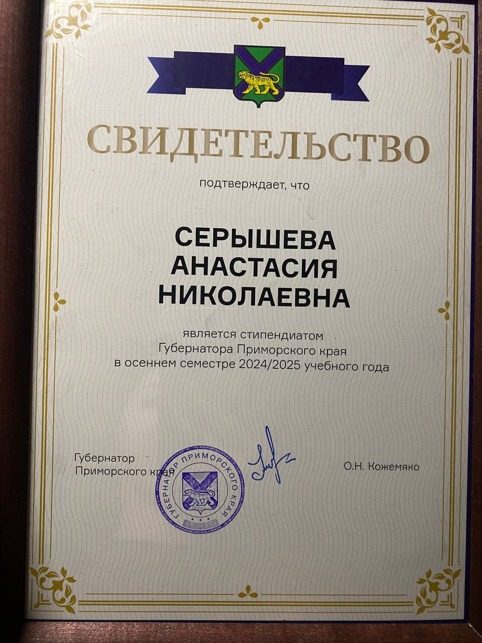 Конкурс на губернаторскую стипендию в осеннем семестре | Городской, краевой | 31.10.2024 | Победитель или призер |