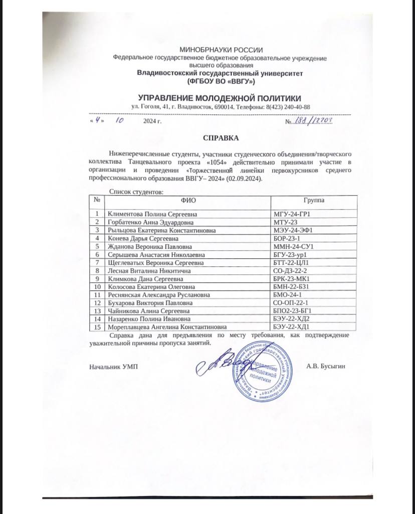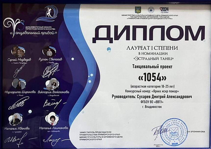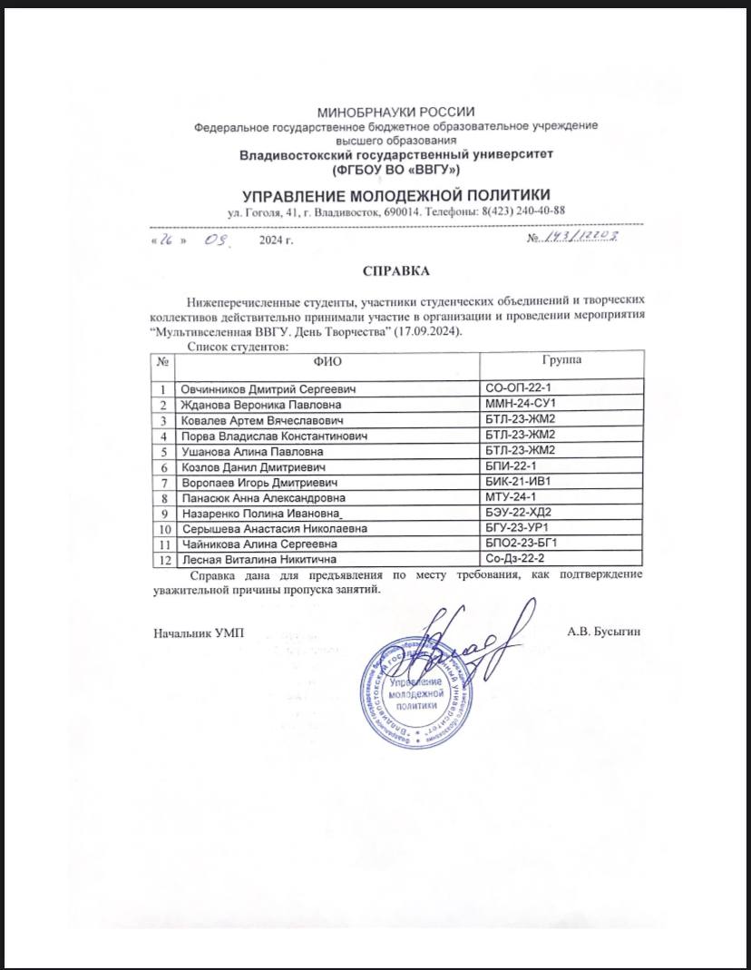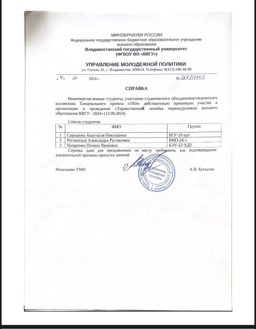 "Торжественная линейка первокурсников высшего образования ВВГУ 2024" | Внутривузовский | 13.09.2024 | Участник |