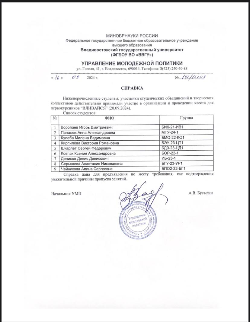 квест "Вливайся" | Внутривузовский | 20.09.2024 | Участник |