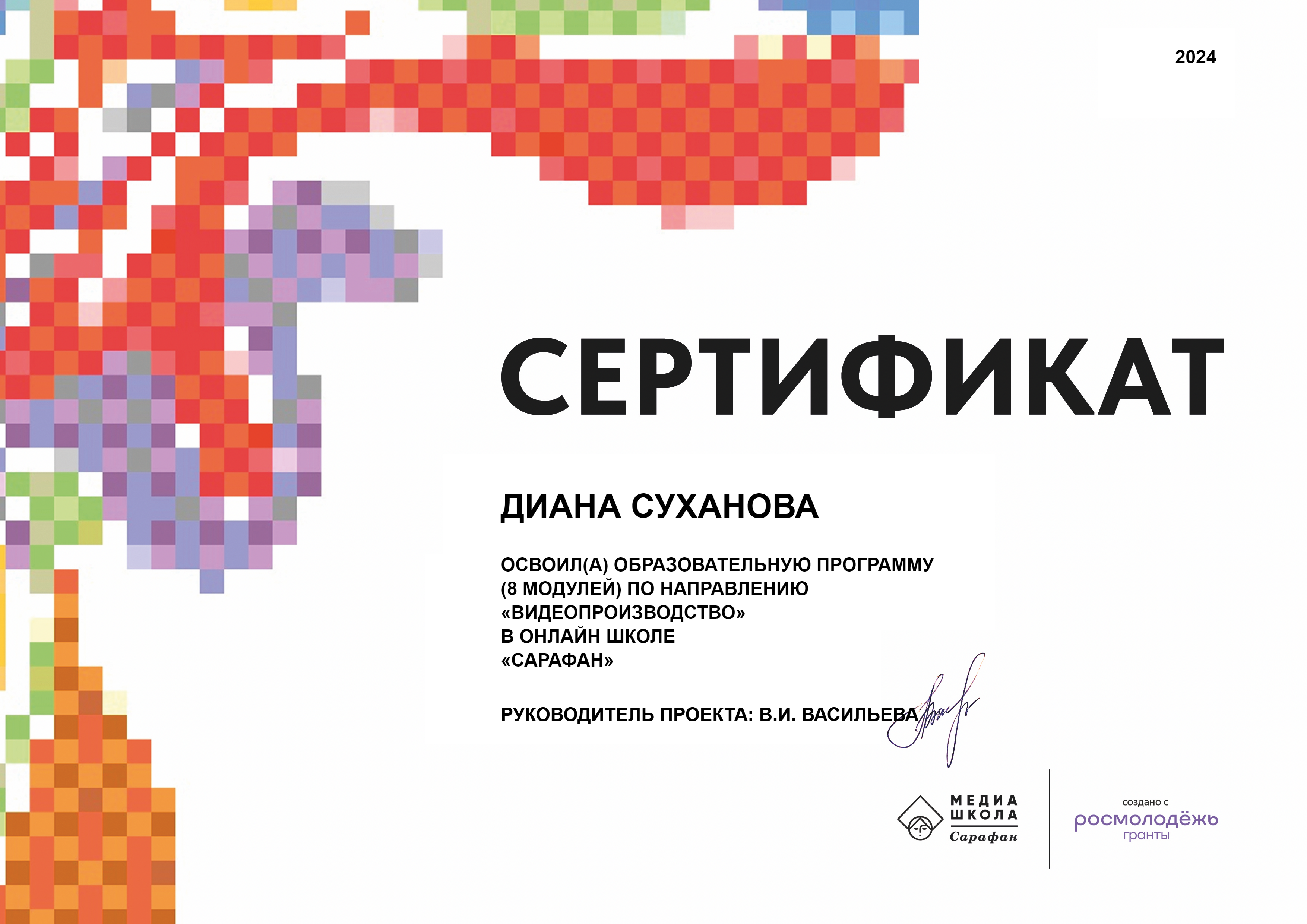 Онлайн медиашкола «Сарафан» | Учебная деятельность | Всероссийский | 26.09.2024 - 29.09.2024 | Освоила образовательную программу по направлению «Видеопроизводство» |
