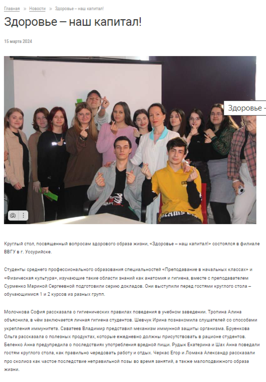Круглый стол "Здоровье наш капитал" | Внутривузовский | 13.03.2024 - 13.03.2024 | Участник |