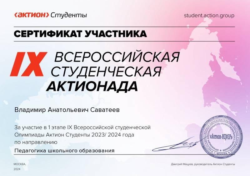 "IX Всероссийская Студенческая Актионада" | Всероссийский | 13.02.2024 - 13.02.2024 | Участник |