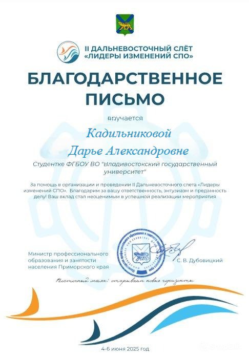 II Дальневосточный слет «лидеры изменений СПО | Всероссийский | 04.06.2025 - 06.06.2025 | Участник |