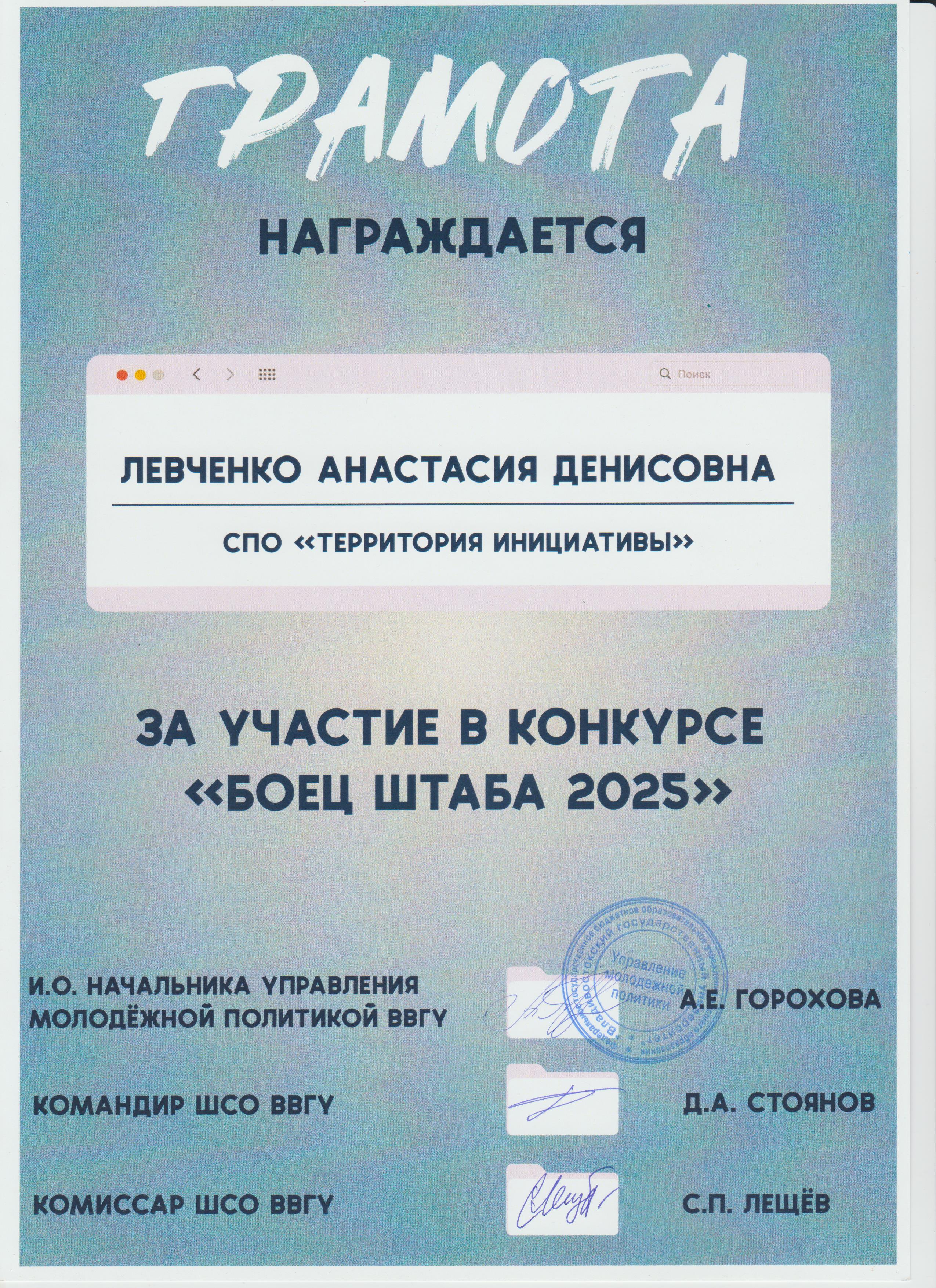 Внутривузовский конкурс на звание "Боец штаба" Внутривузовский 05.05.2025 - 25.05.2025 Участник Грамота