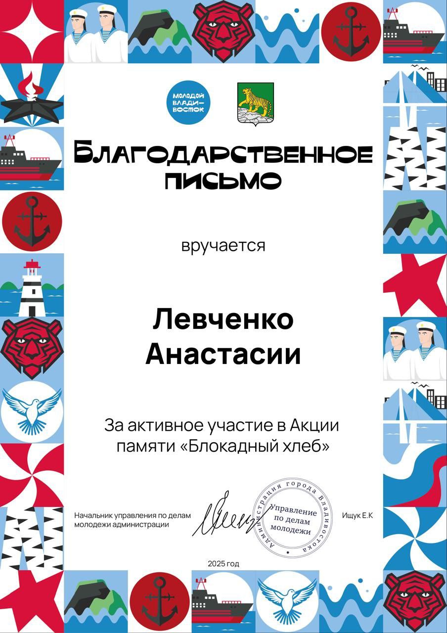 Социальная акция "Блокадный хлеб" Городской, краевой 23.01.2025 - 27.01.2025 Участник Благодарственное письмо