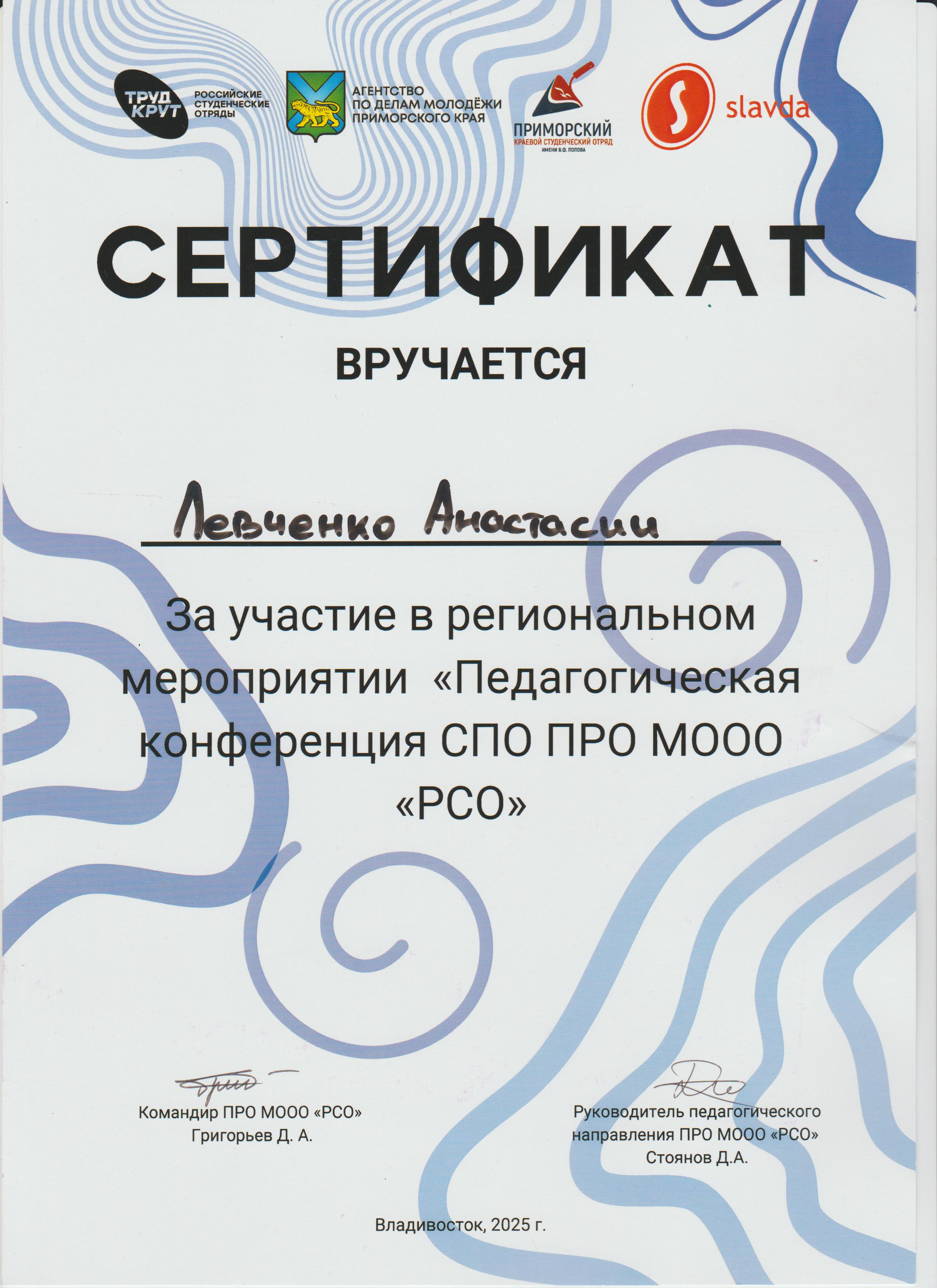 Педагогическая конференция СПО ПРО МООО "РСО" Городской, краевой 19.04.2025 - 20.04.2025 Участник Сертификат