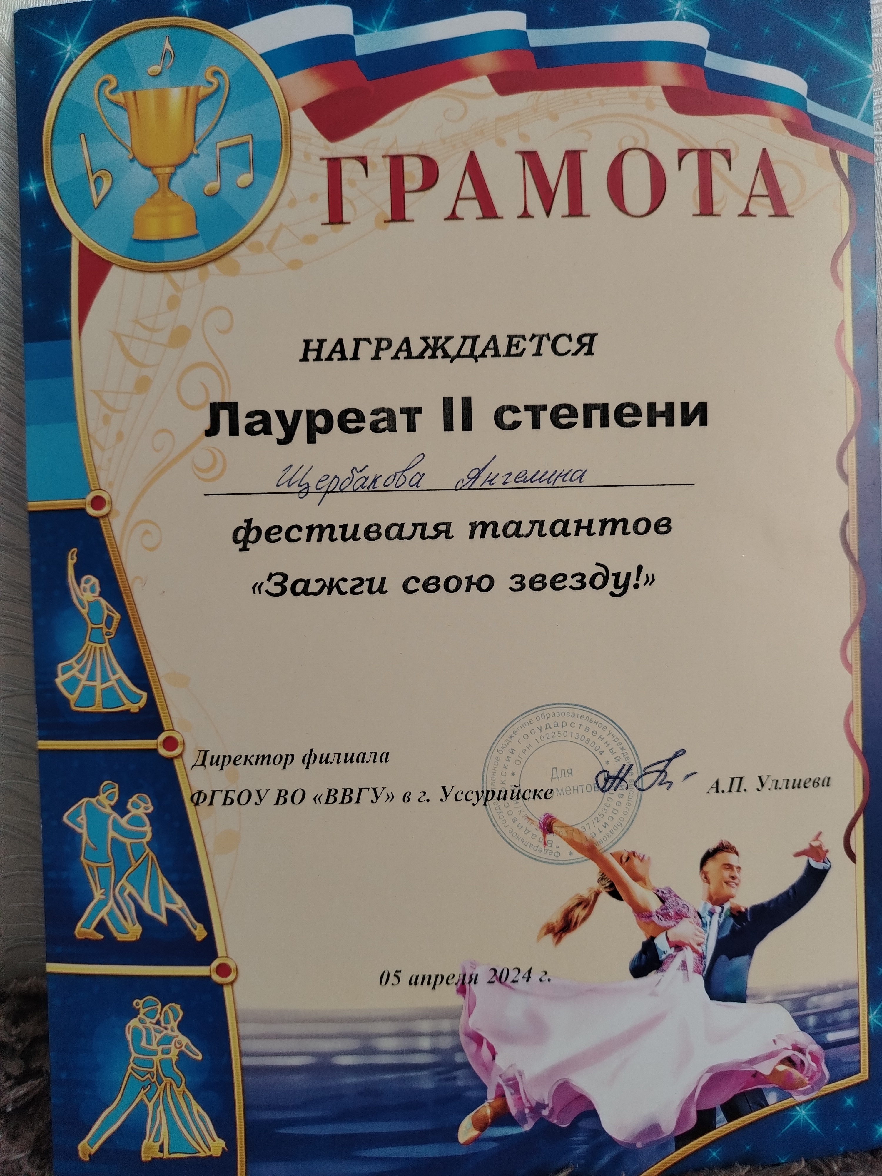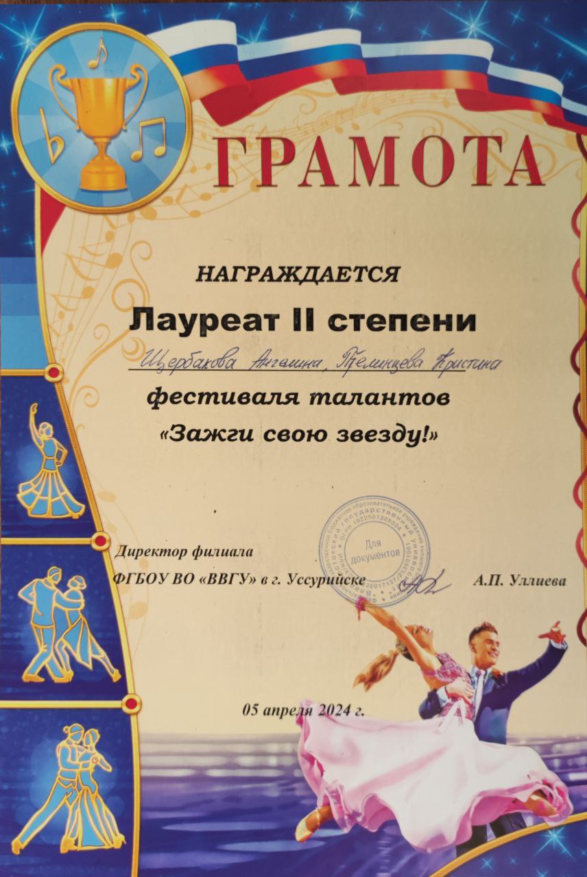 Фестиваль талантов"Зажги свою звезду" | Внутривузовский | 05.04.2024 | 2 место |