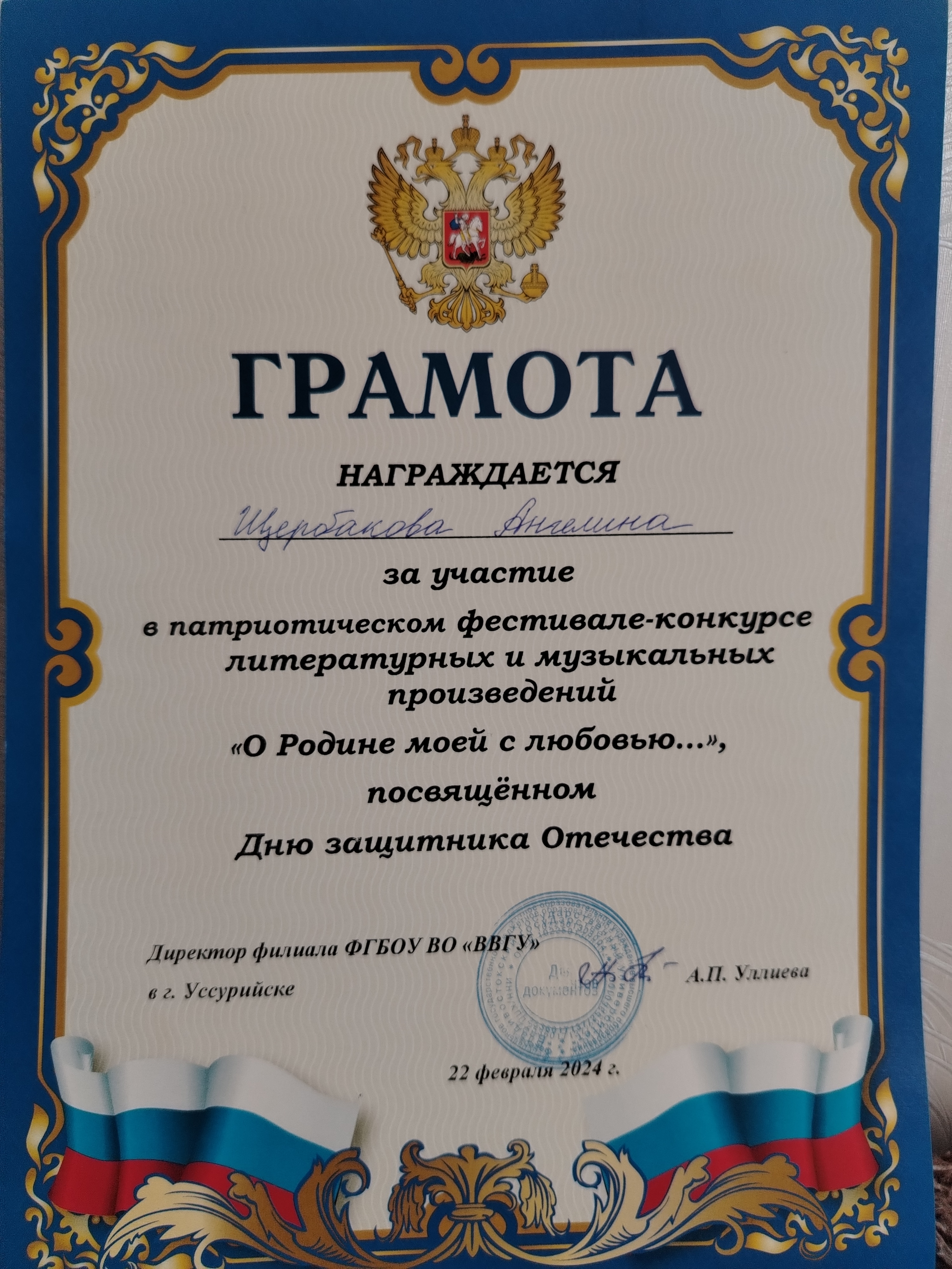 Конкурс литературных и музыкальных произведений " О Родине моей с любовью" | Внутривузовский | 22.02.2024 | Участник |